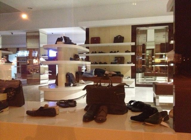 Din nefericire pentru el insa, un trecator, care s-a oprit in fata vitrinei pentru a admira o pereche de pantofi, l-a vazut si l-a fotografiat.