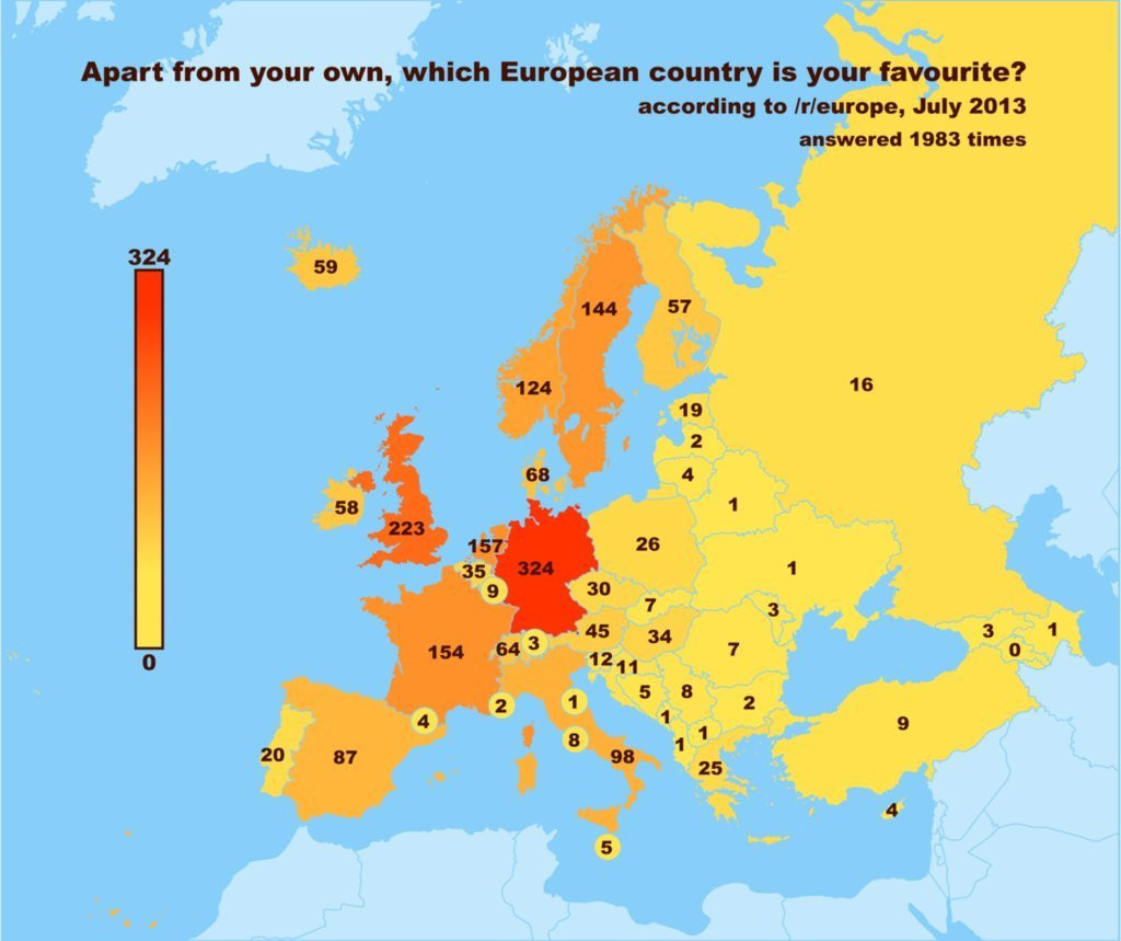 Rezultatele au fost compilate si publicate sub forma de harti de cei de la Business Insider. Chiar daca sondajul nu este realizat pe un esantion reprezentativ pentru intreaga populatie, arata cam ce crede internetul despre tarile europene.
