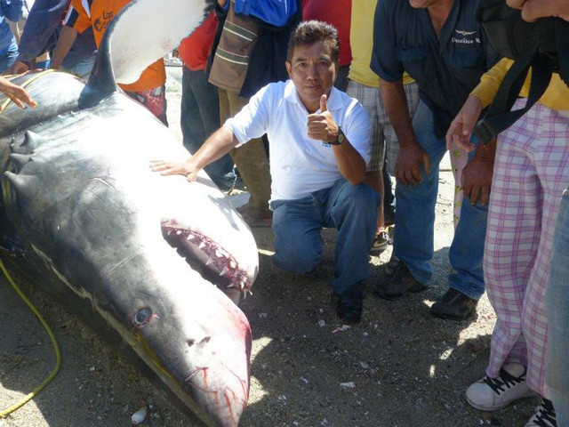 Guadalupe si Baltazar, cei doi pescari ce si-au castigat deja notorietatea in regiune, au tras rechinul cu barca pana aproape de plaja.