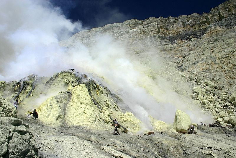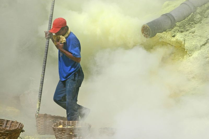 Barbatii, care de obicei nu ajung sa depaseasca varsta de 30 de ani, lucreaza la minele de sulf de langa vulcanul activ Ijen, de pe insula Java, din Indonezia.
