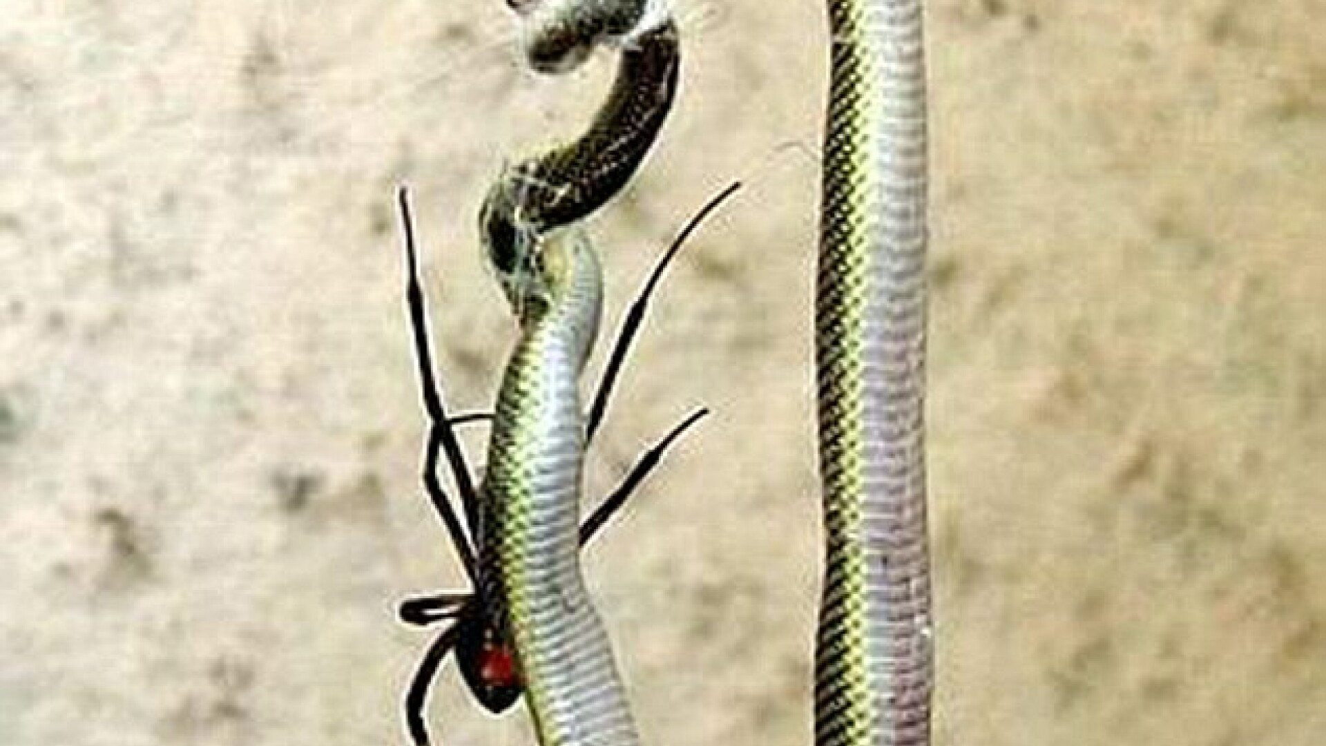 In imaginile surprinse undeva in Africa de Sud se observa cum un sarpe de 14 centimetri este prins in panza unei femele paianjen din familia celor cu spatele rosu, aproape la fel de periculoasa ca vaduva neagra.