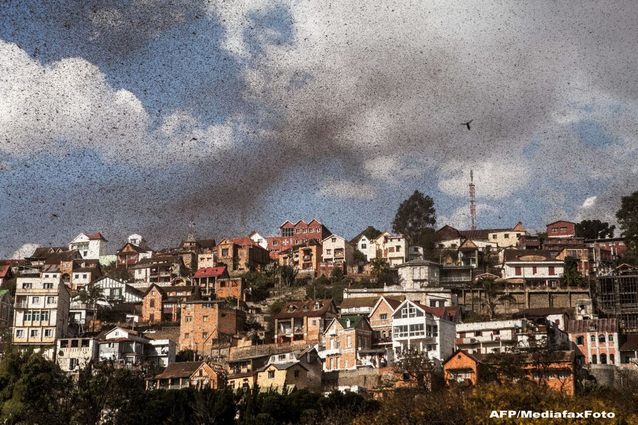Un stol format din milioane de lacuste a navalit peste capitala Madagascarului, Antananarivo, pe 28 august 2014. Incidentul a provocat probleme in traficul autoturismelor si a acoperit cerul orasului.