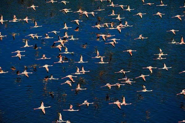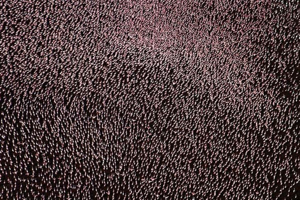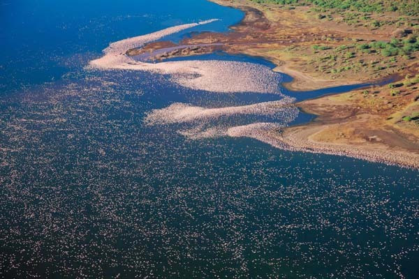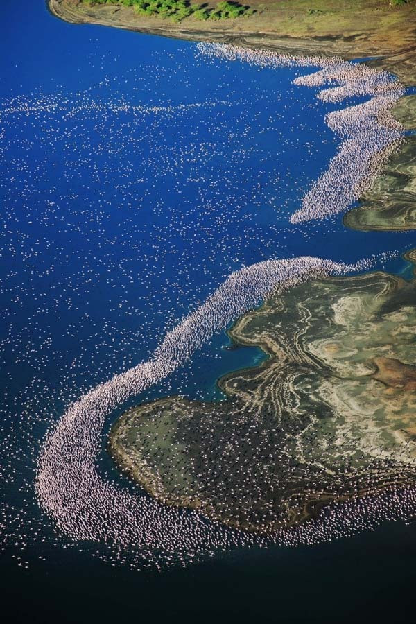 Un spectacol de culoare poate fi vizibil anual din aer deasupra lacului Nakura din Kenya, unde milioane de pasari Flamingo roz acopera tarmul.