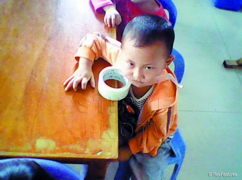 Intr-una din ele, un copil are gura lipita cu banda adeziva, sugerand ca educatoarea l-a obligat astfel sa nu vorbeasca. Mainile ii sunt, de asemenea, lipite cu banda de banca.
