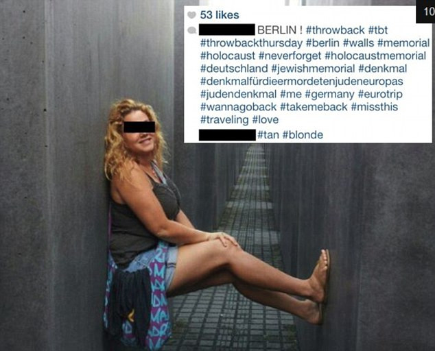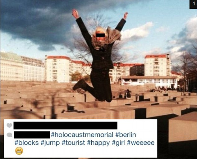 Intr-una din poze, facuta in Berlin, la locul comemorarii celor sase milioane de evrei masacrati de nazisti, o tanara face chiar un gest vulgar, in timp ce alte doua prietene isi fac un selfie.