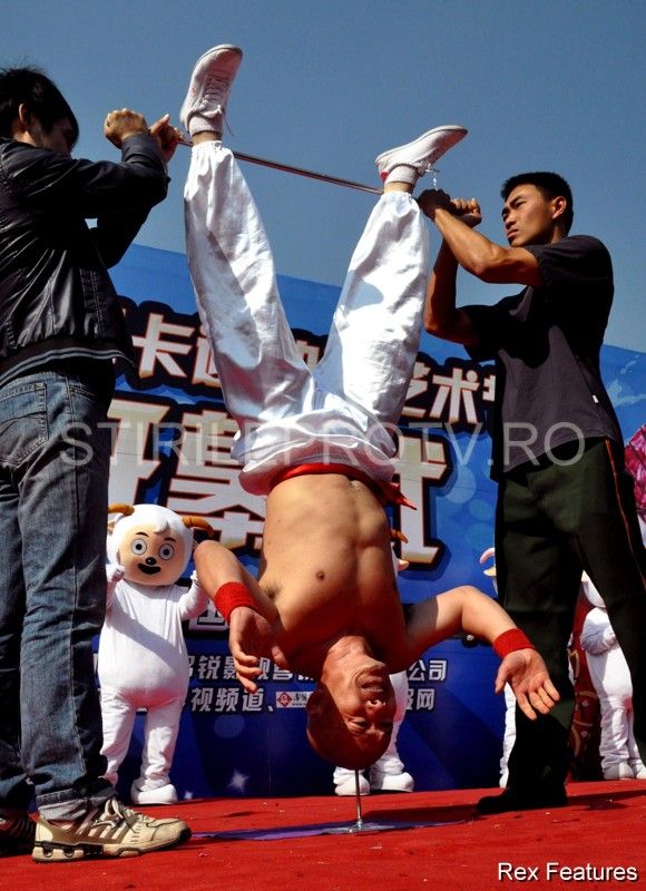 Daca aveai impresia ca jobul tau iti da dureri de cap, priveste cu atentie aceste imagini. Cascadorul chinez Li Xin sta in cap pe un cui. Da, ati citit bine!