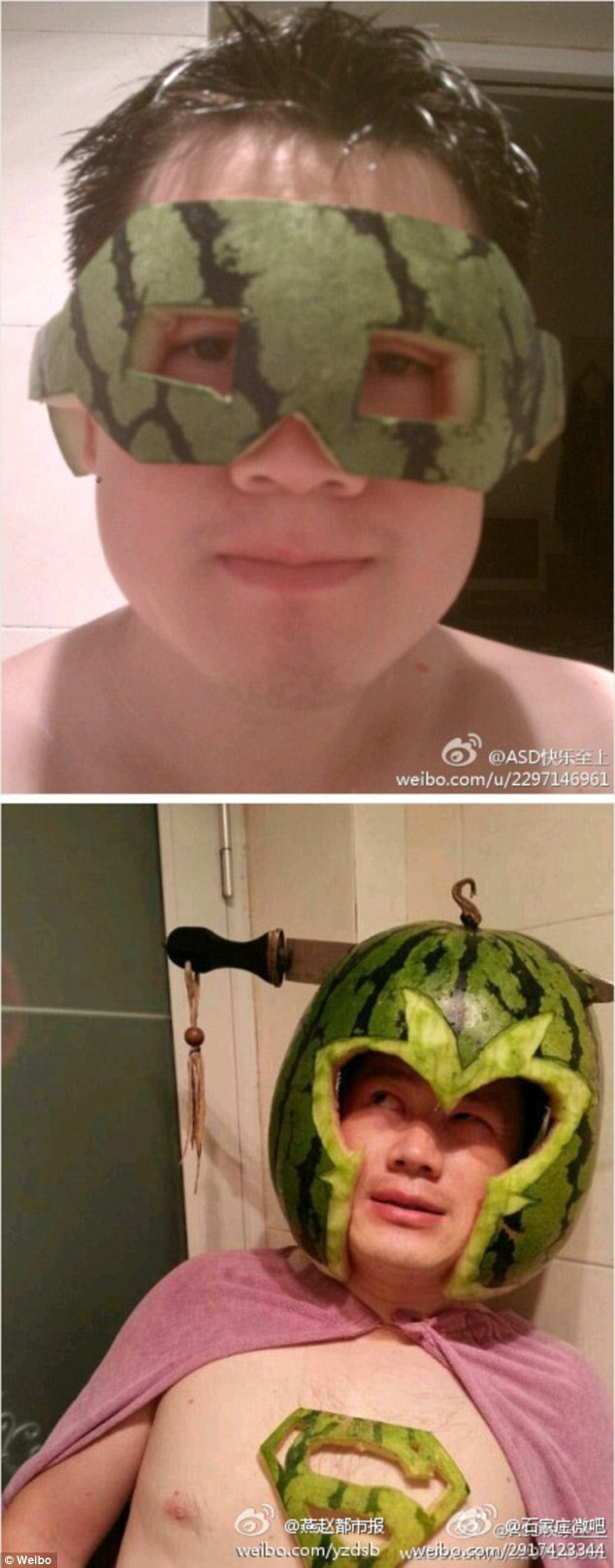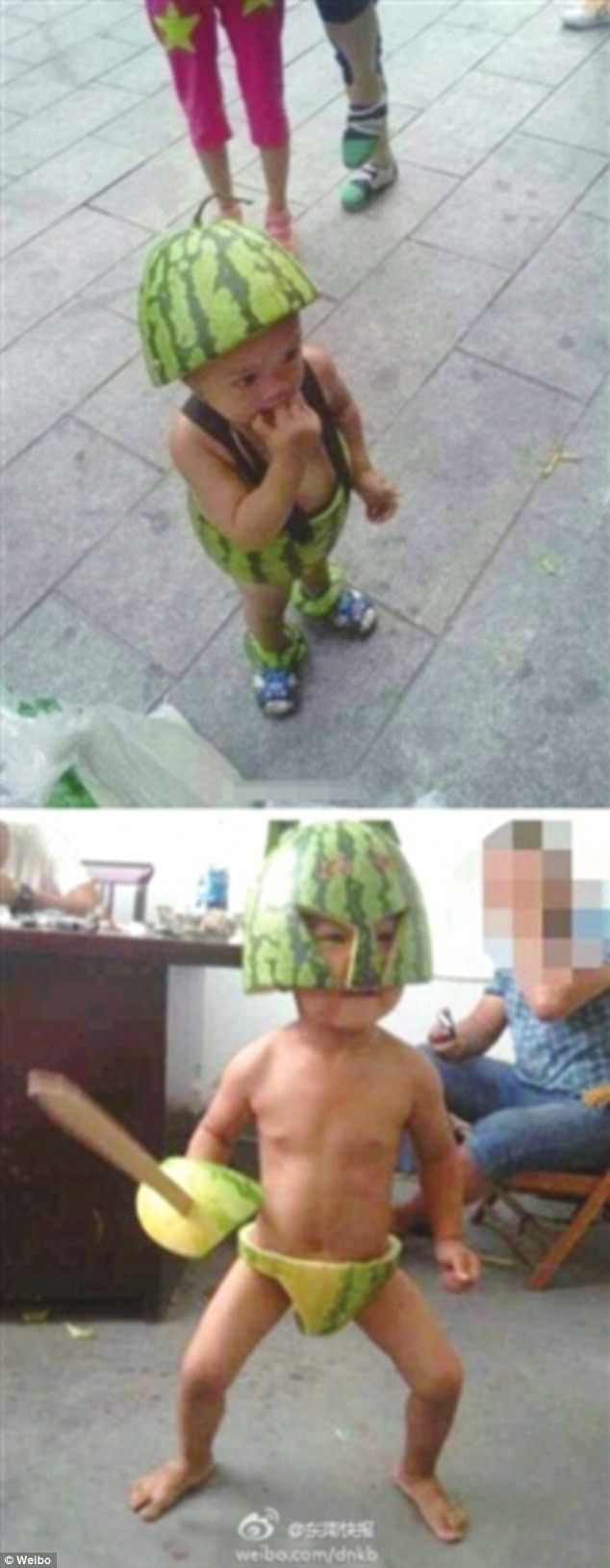 Si-a imbracat copilul intr-un pepene. Solutia unui barbat din China impotriva caniculei