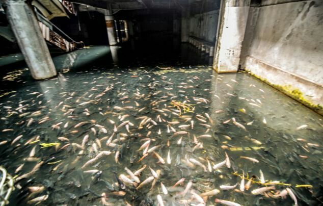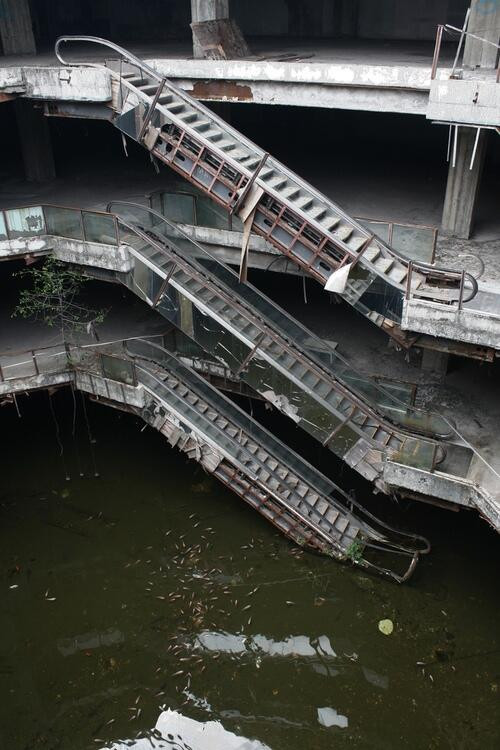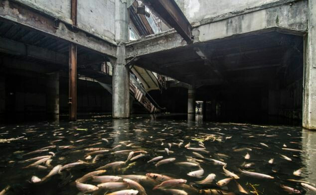 Desi au trecut 17 ani de cand centrul comercial nu mai este folosit, locuitorii au descoperit ca in interiorul lui se duce o viata linistita, o adevarata locuinta pentru cateva bancuri de pesti.