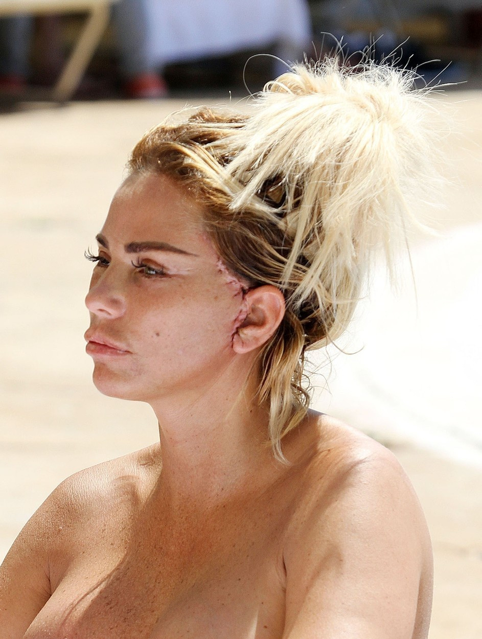 Mai mult, Katie a făcut plajă topless, lăsând la vedere bandajele aplicate după operaţia de la sâni.