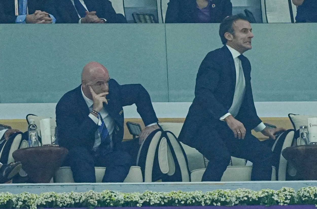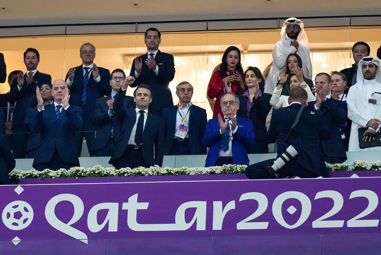 Macron a putut fi văzut foarte bine dispus, arătându-i la un moment dat ceva pe telefon președintelui FIFA, Gianni Infantino.