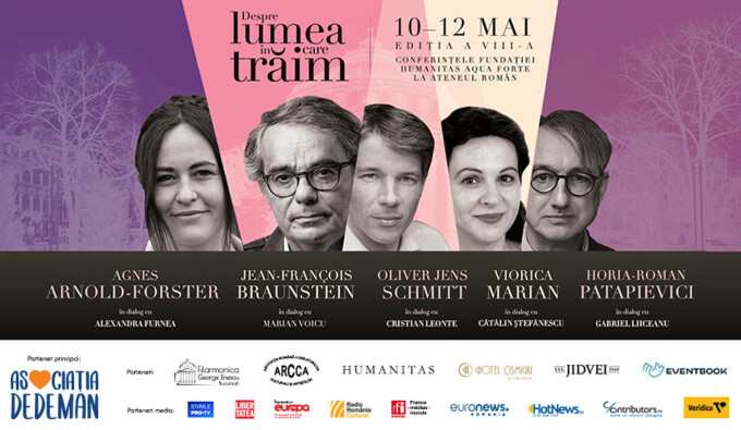 În perioada 10–12 mai, vor fi prezenți pe scena Ateneului Român, la cea de-a opta ediție a festivalului de conferințe „Despre lumea în care trăim“, Agnes Arnold-Forster, Jean-François Braunstein, Oliver Jens Schmitt, Viorica Marian, Horia-Roman Patapievici și partenerii lor de dialog, Alexandra Furnea, Marian Voicu, Cristian Leonte, Cătălin Ștefănescu, Gabriel Liiceanu.