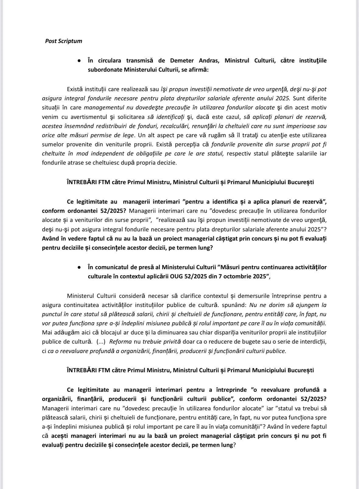 Documentul se adresează, într-un Post Scriptum, și ministrului Culturii și premierului, în condițiile în care practica managerilor interimari numiți politic afectează inclusiv fondurilor alocate culturii.