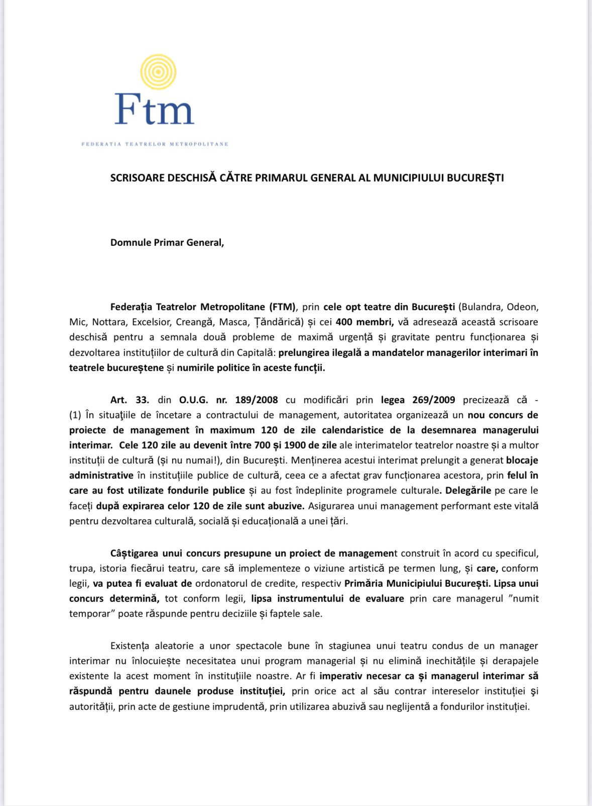”Federația Teatrelor Metropolitane (FTM), prin cele opt teatre din București (Bulandra, Odeon, Mic, Nottara, Excelsior, Creangă, Masca, Țăndărică) și cei 400 membri, vă adresează această scrisoare deschisă pentru a semnala două probleme de maximă urgență și gravitate pentru funcționarea și dezvoltarea instituțiilor de cultură din Capitală: prelungirea ilegală a mandatelor managerilor interimari în teatrele bucureștene și numirile politice în aceste funcții”, se arată într-un comunicat al federației.
