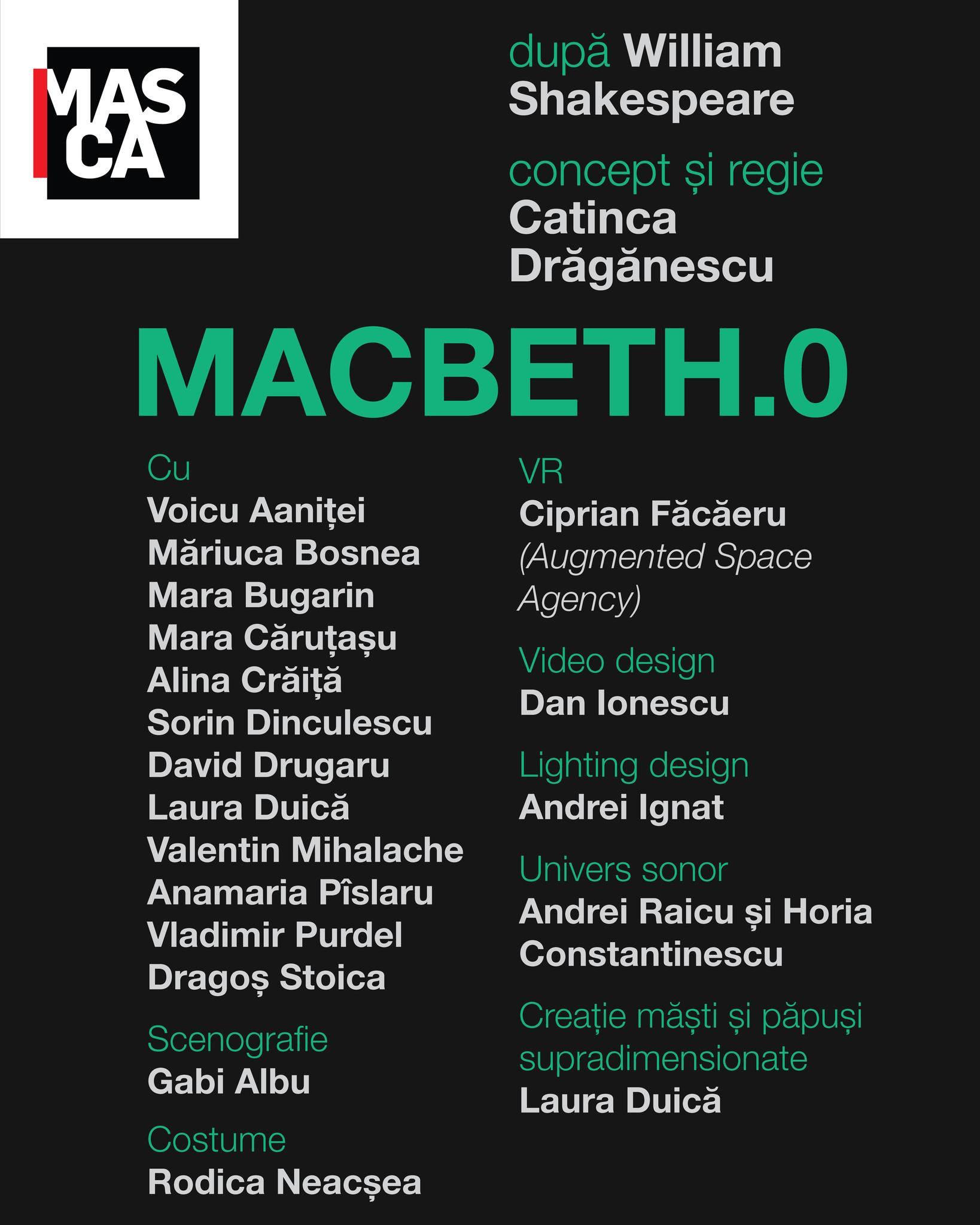 Teatrul Masca anunță premiera Macbeth.0, o adaptare contemporană după William Shakespeare în regia Catincăi Drăgănescu, în care liniile dintre tragedie shakespeariană și realități virtuale se diluează, iar ambiția devine o unealtă de manipulare a sistemului.