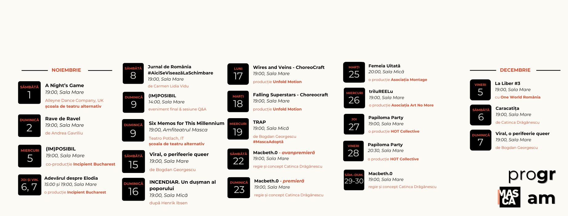 Programul complet al Teatrului Masca, aici - https://www.masca.ro/teatru/calendar/
