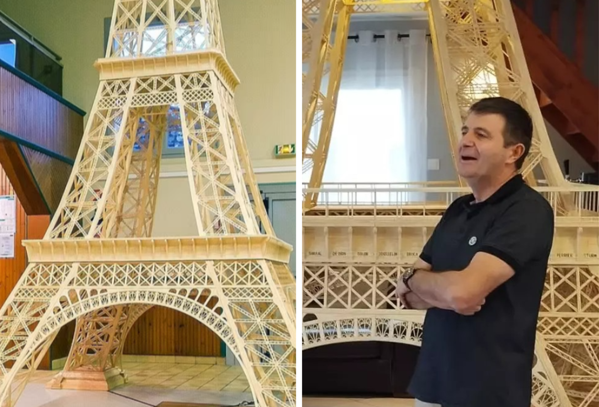 Un bărbat a petrecut opt ani construind Turnul Eiffel de 23 de metri din 700.000 de bețe de chibrit, însă nu a intrat în Cartea Recordurilor pentru că a folosit tipul greșit de chibrituri.