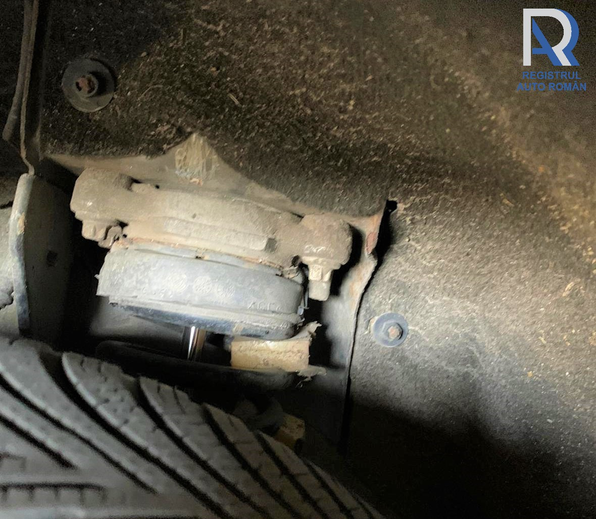 Acest vehicul s-a prezentat la RAR Tulcea pentru redobândirea certificatului de îmnatriculare, reținut în urma unui control în trafic. Verificând mașina, colegii noștri au observat bucățile de cauciuc dur introduse între spirele unuia dintre arcurile suspensiei.