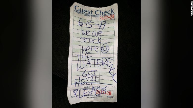 Ulterior le-a venit în minte ingenioasa idee de a scrie un mesaj pe o foaie de hârtie pe care să o introducă într-o sticlă și să o arunce în apele râului, în speranța că cei aflați în apropiere îi vor salva. De asemenea, bărbatul a scrijelit cuvântul AJUTOR pe recipientul de plastic.