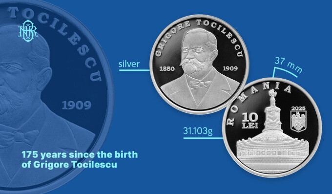 Monedele din argint cu tema 175 de ani de la naşterea lui Grigore Tocilescu au putere circulatorie pe teritoriul României.