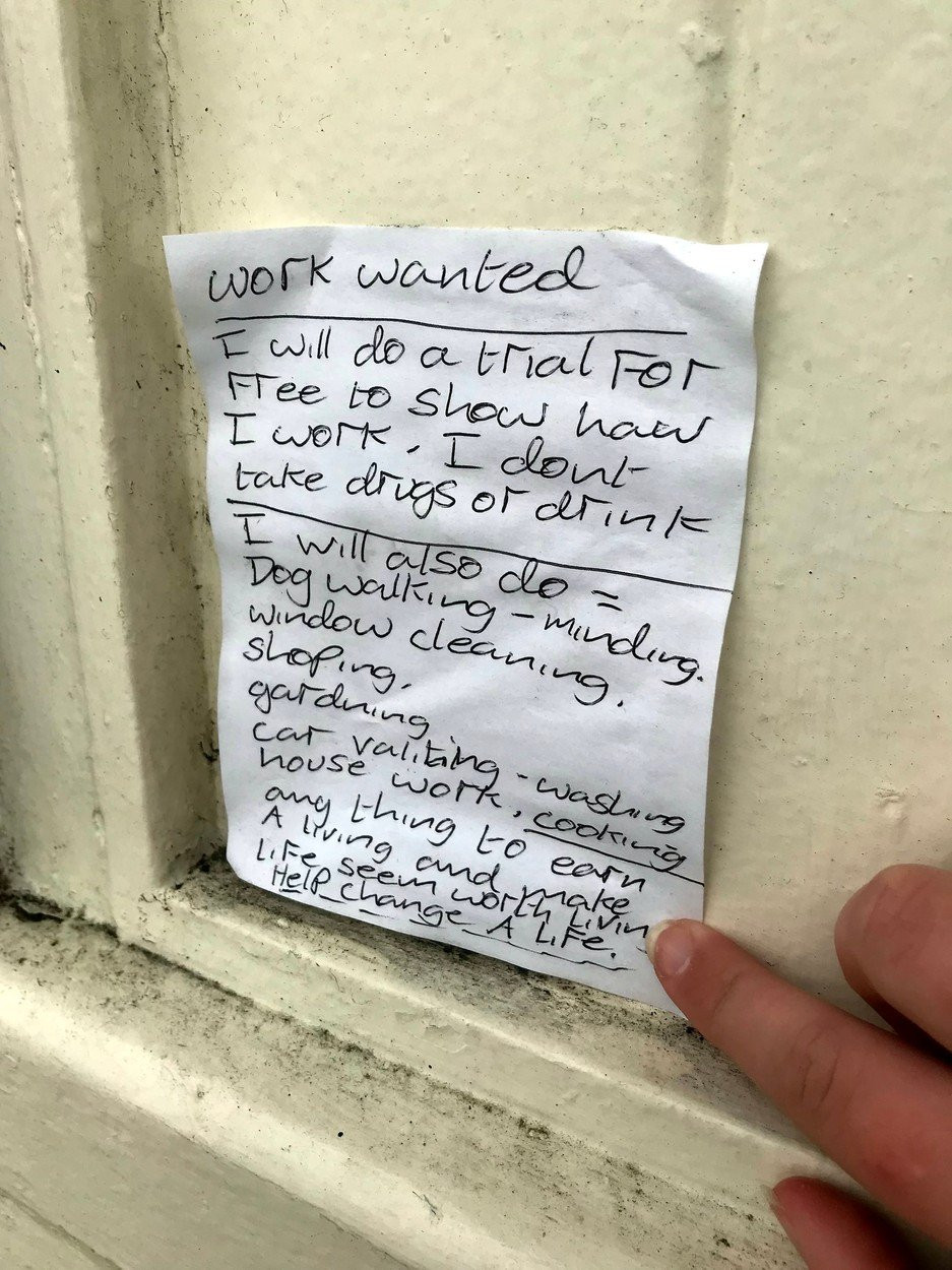 Un bărbat fără adăpost din Anglia a scris un bilet în care spune că se oferă să lucreze fără să fie plătit „doar pentru a da un sens vieții”.
