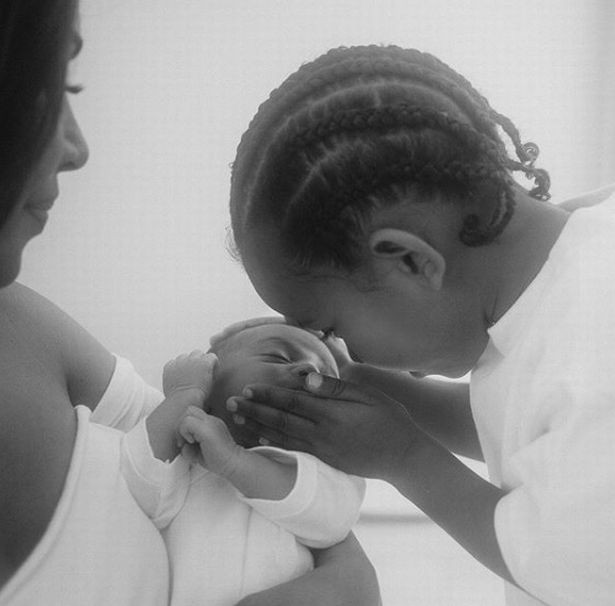 Vedeta a reușit să surprindă un moment emoționant între cei doi fii ai săi. În imagine, Kim îl ține în brațe pe Psalm, iar fiul ei mai mare, Saint, sprijină, cu grijă, capul beblușului.