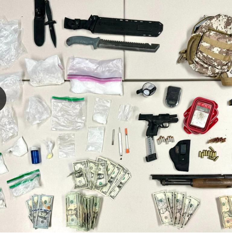 Atunci când au percheziționat vehiculul, polițiștii au descoperit narcotice, inclusiv metamfetamină, Xanax, cocaină și fentanil, precum și o pușcă și două pistoale încărcate. Una dintre arme era „ascunsă” deasupra unei pizza într-o cutie.