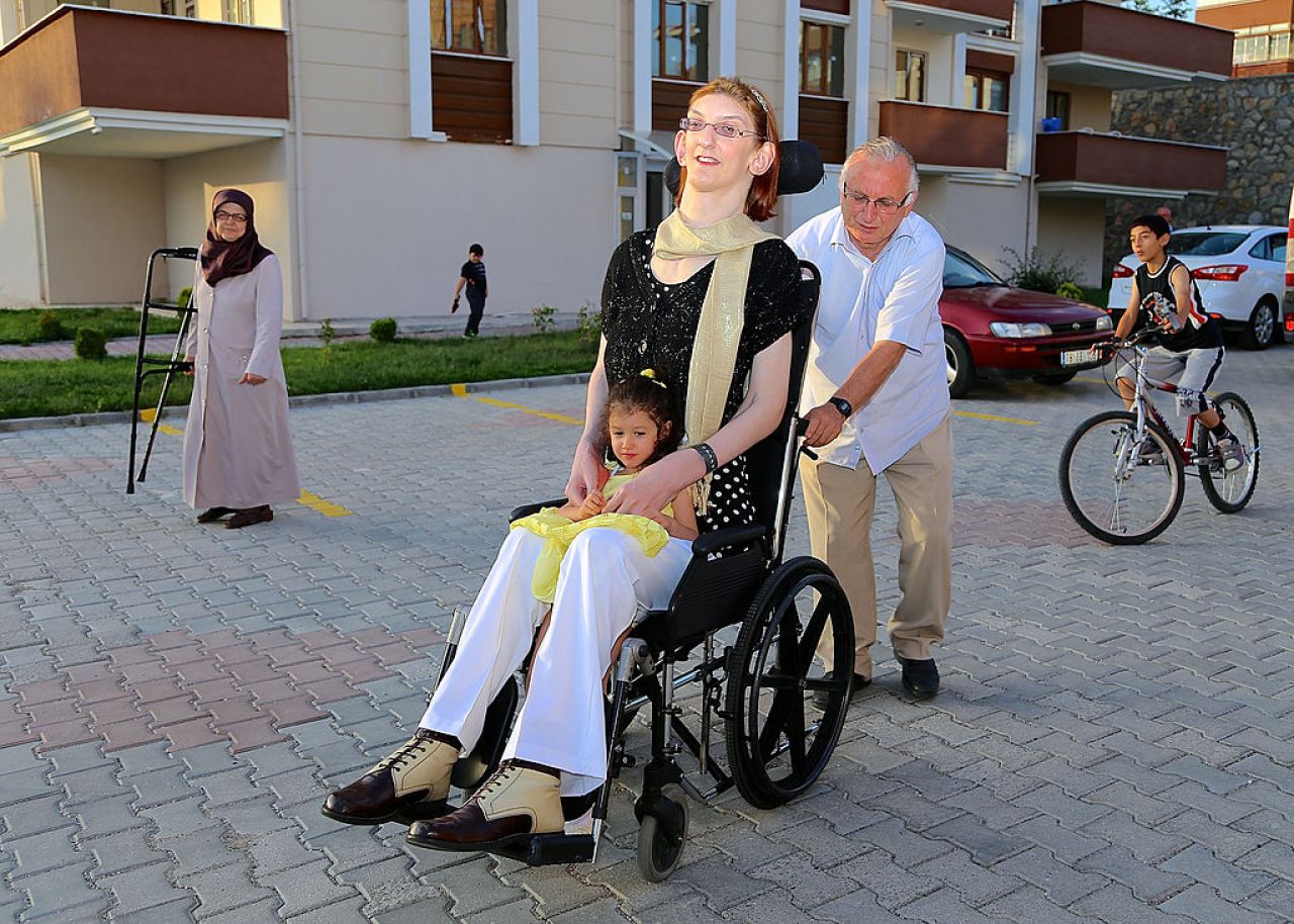 În cea mai mare parte a timpului, ea foloseşte un scaun cu rotile, deşi poate merge cu ajutorul unui cadru.