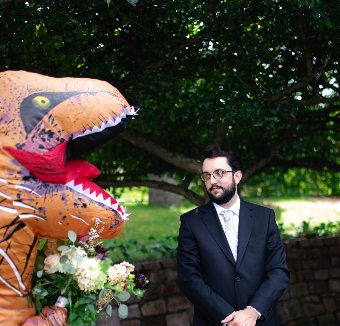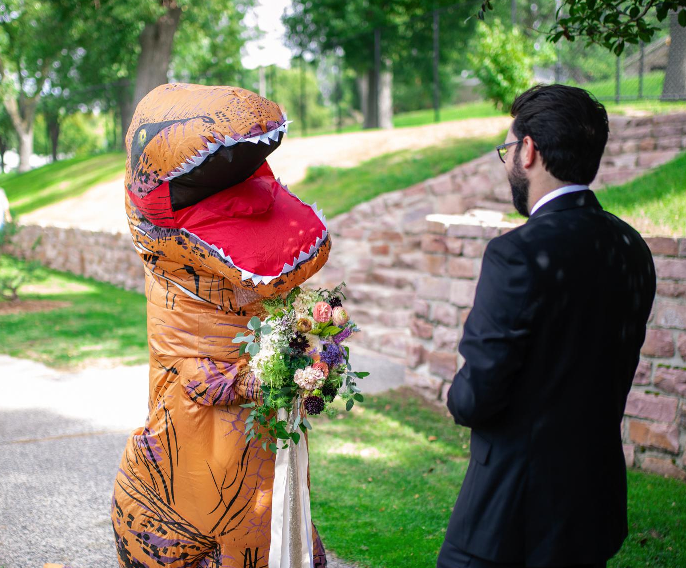 Mai multe imagini surprind reacția bărbatului după ce viitoarea lui soție apare îmbrăcată într-un costum de T-Rex, în locul rochiei albe de mireasă, informează The Sun.