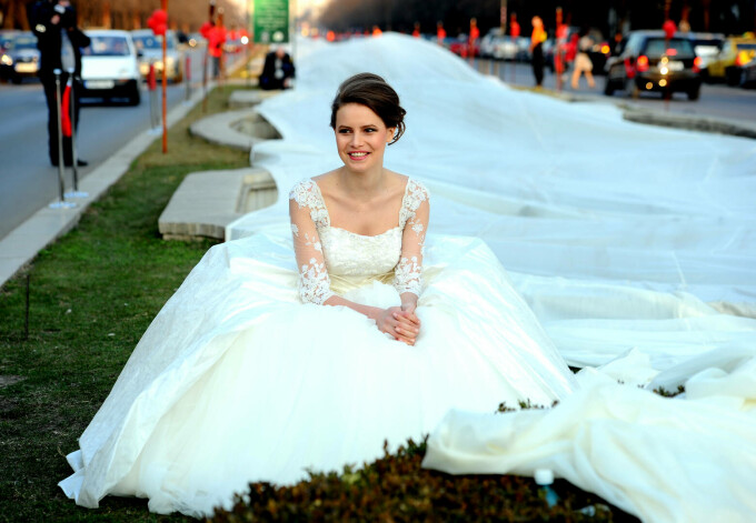 Trena ivoire, cu o lungime de 2,98 km, purtată de modelul de 17 ani Ema Dumitrescu, a plutit deasupra unui bulevard principal din capitala României.