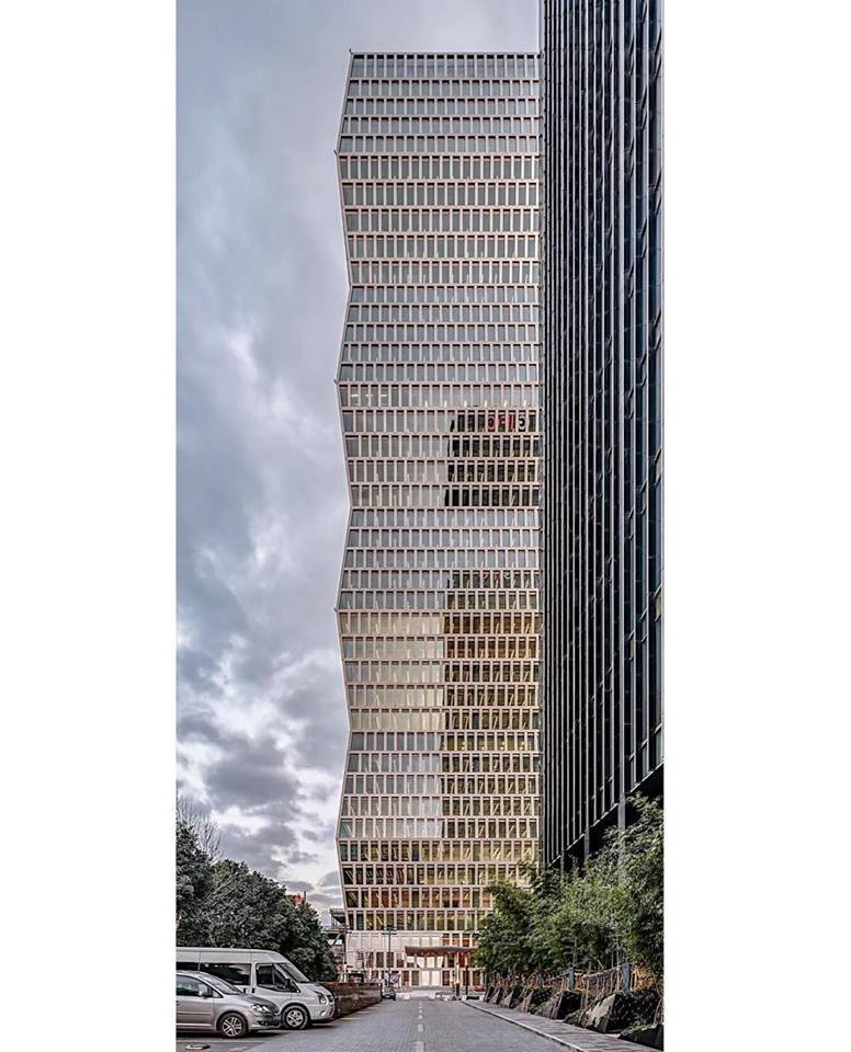 Clădirea de birouri se ridică ca un obelisc a cărui structură pare că se unduiește și cu un profil în zig-zag.