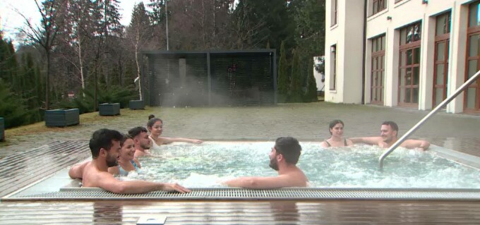 Un grup de turiști din București, ajuns în Poiana Brașov, a savurat acest jacuzzi în aer liber, chit că vremea era mohorâtă.