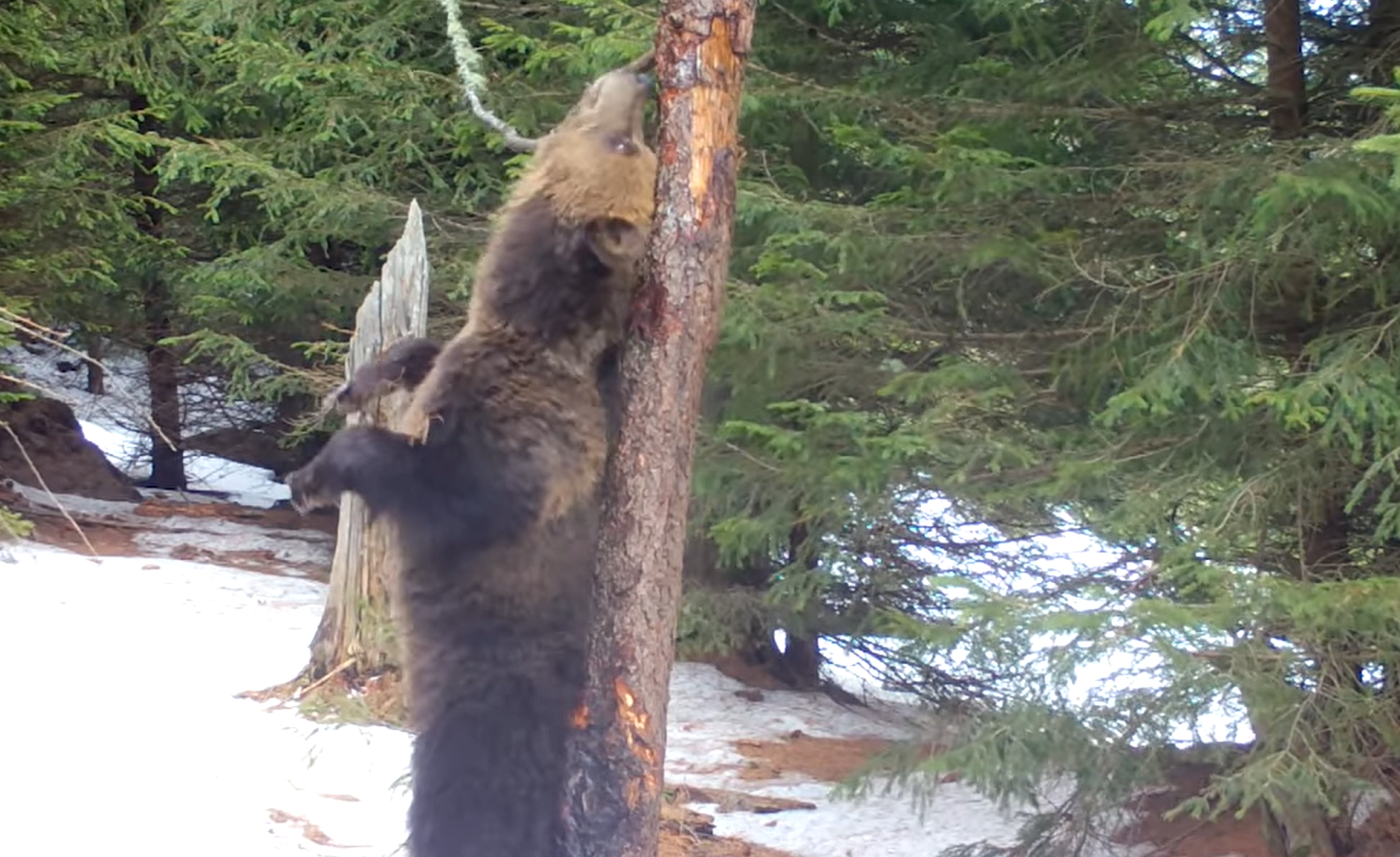 Mai multe exemplare de urs au fost surprinse de camerele pentru monitorizarea faunei, în timp ce se scărpinau de scoarța unui arbore, în Parcul Natural Bucegi.