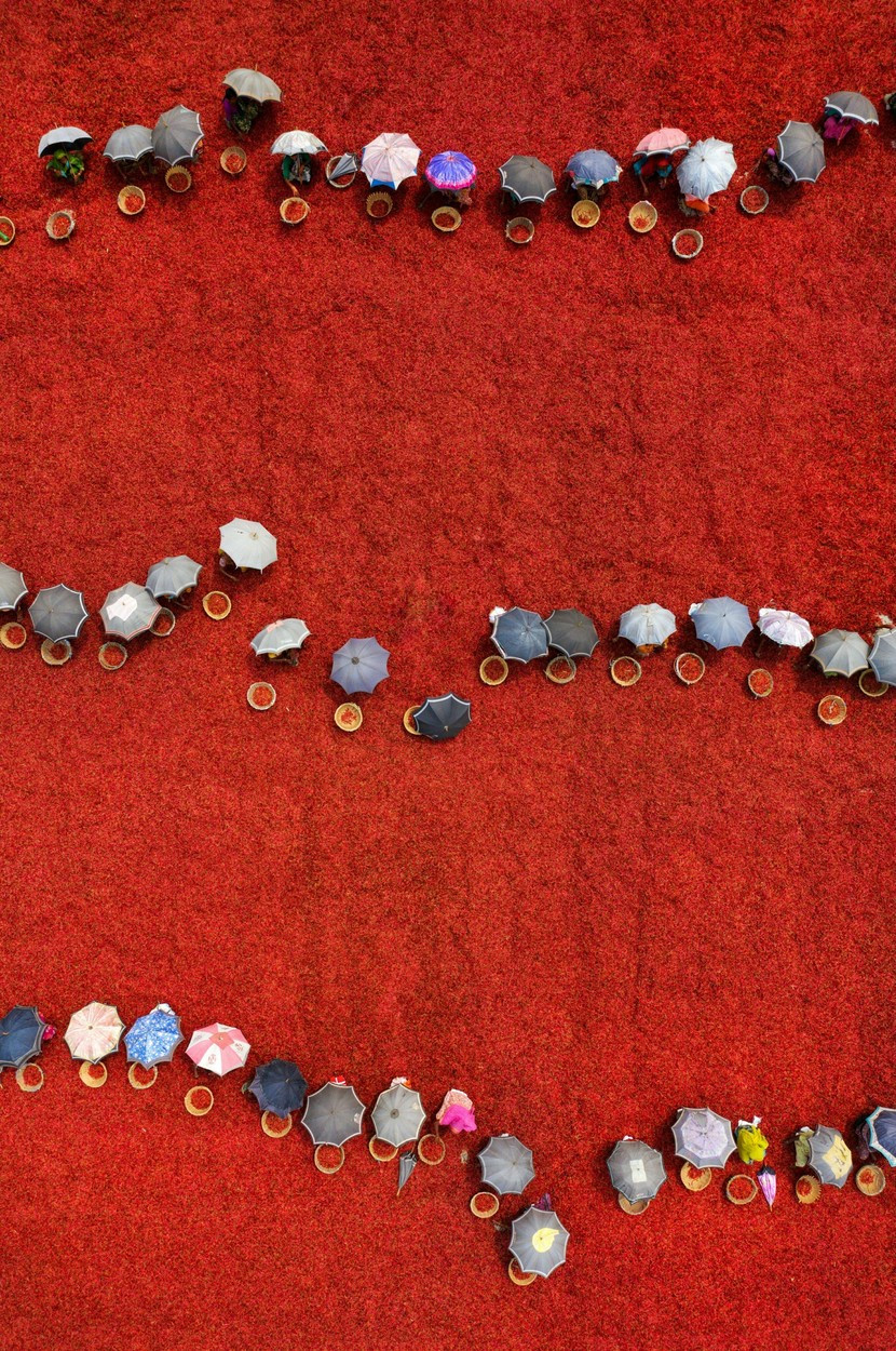 În fotografie se văd mai multe femei, aflate în mijlocul unei „mări roșii” de ardei chili, lăsați în soare să se usuce timp de o săptămână. Aproximativ 120 de femei lucrează la ferma din Sariakandi Upazila, la sortat de ardei iute, potrivit Profimedia.