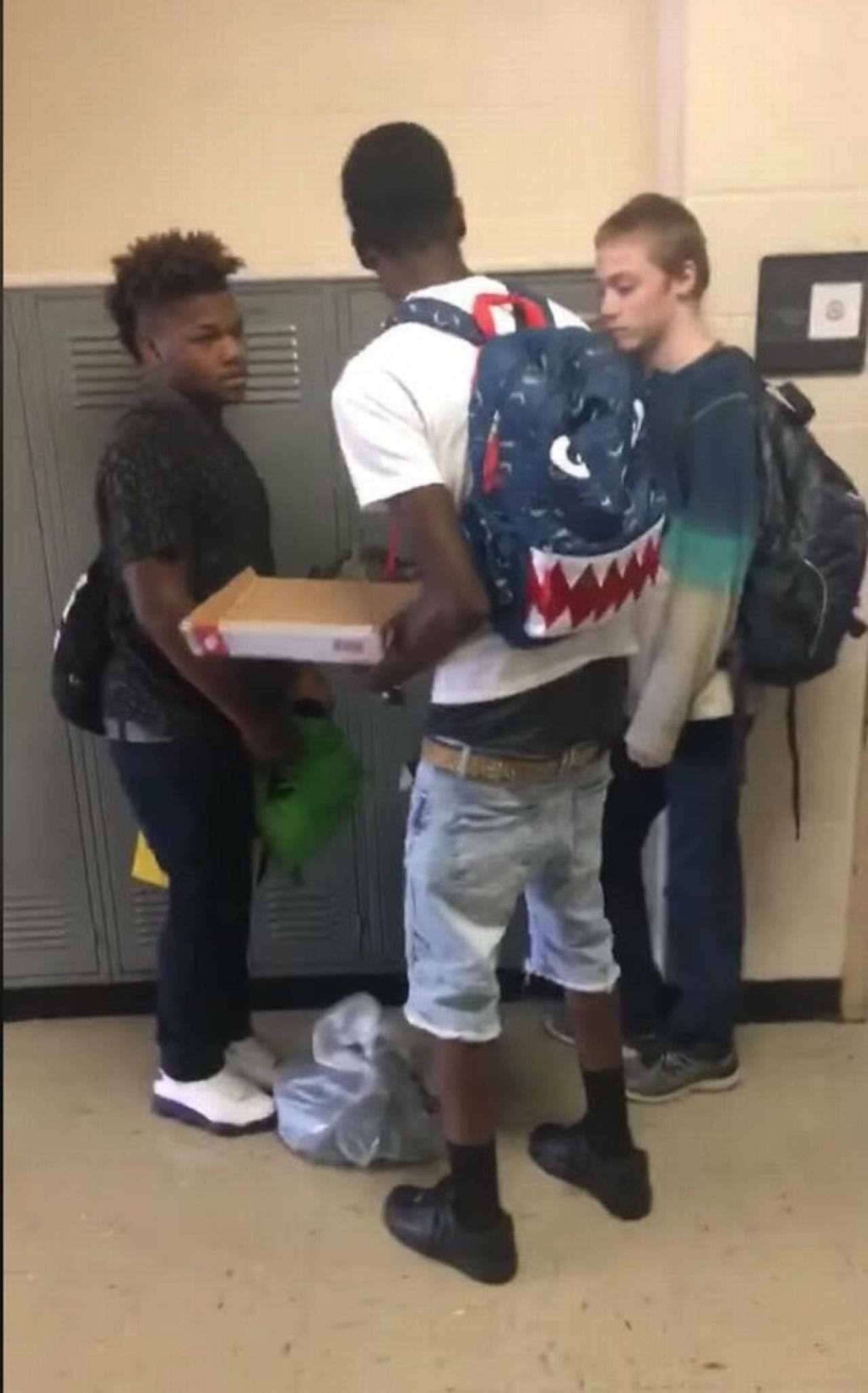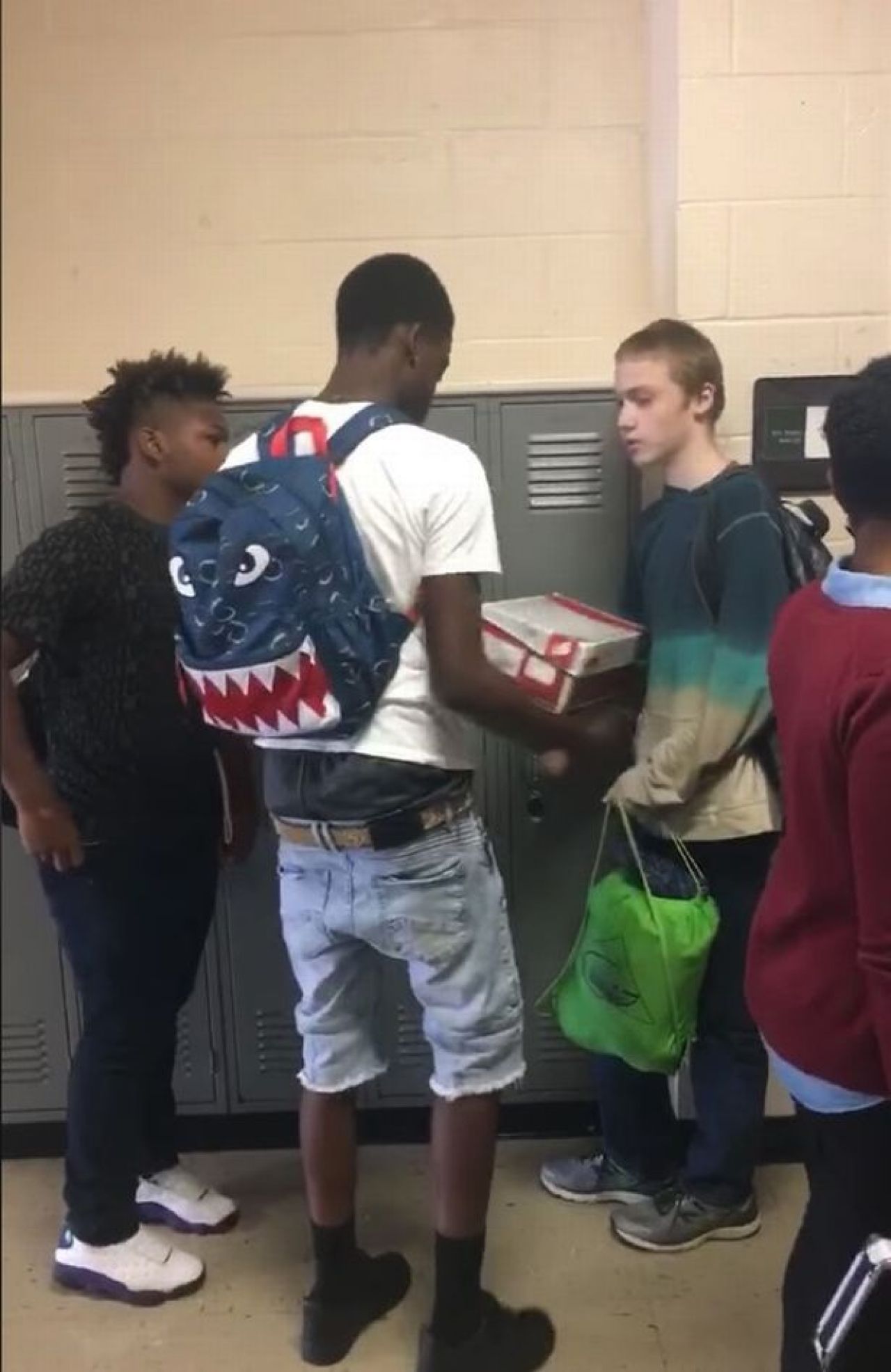 Imaginile au fost surprinse într-o școală din Tennessee. În filmuleț se poate observa cum doi elevi îi dau băiatului mai multe pachete cu haine, informează Mirror.