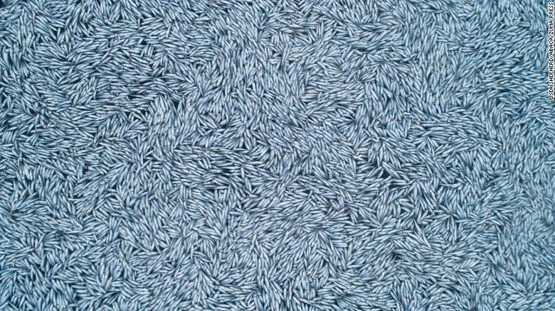 Un covor plutitor de pești morți acoperă mii de metri pătrați.