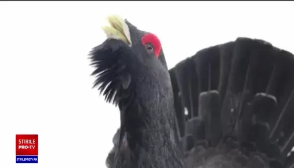 Imagini rare au fost suprinse în munții Bucovinei! Cocoșul de munte, o pasăre protejată prin lege, a fost filmat într-un acces de personalitate, când a vrut să se impună în fața fotografului.
