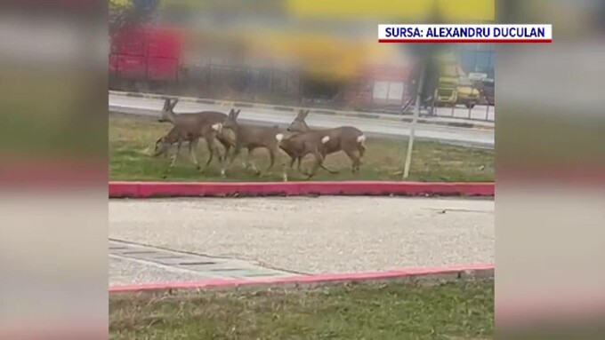 Imagini spectaculoase din Pitești: căprioare surprinse în prima zi de Crăciun, alergând libere lângă un centru comercial