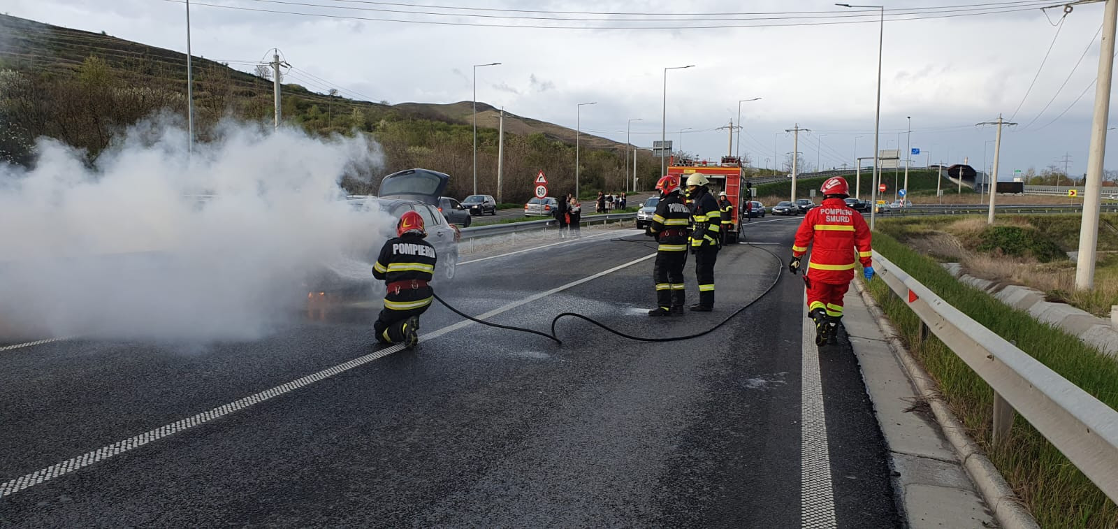 Incident grav pe Autostrada A10. Motorul unei mașini a luat foc. În autoturism se aflau 3 persoane
