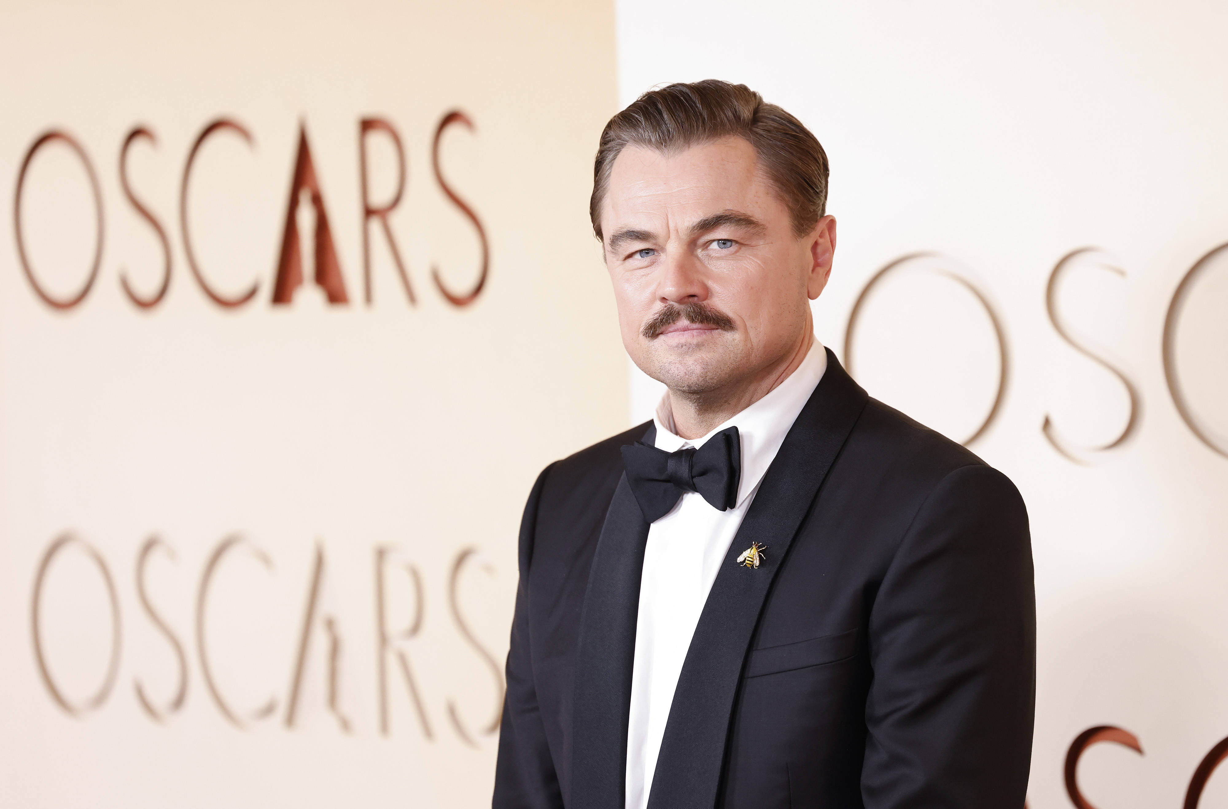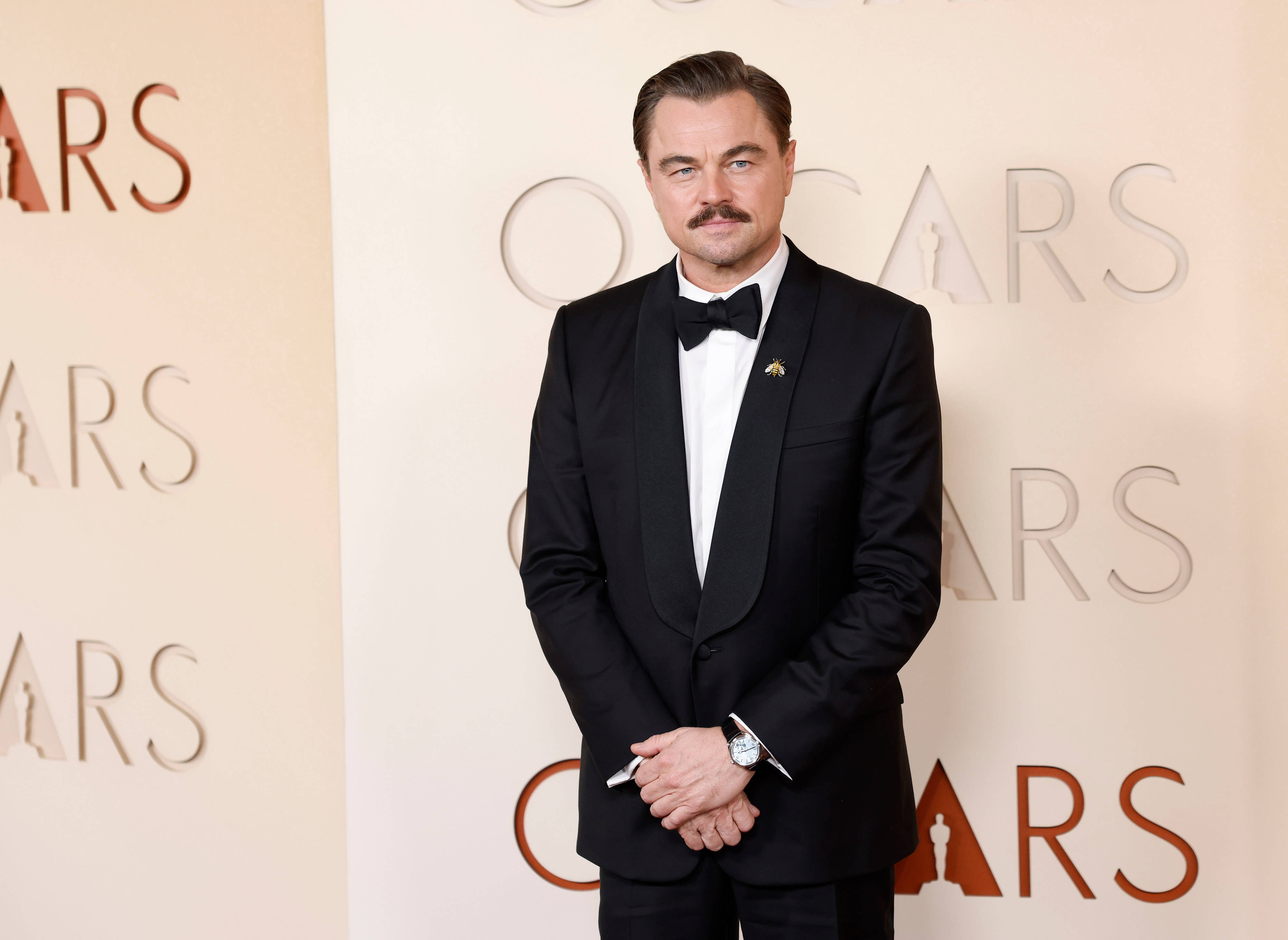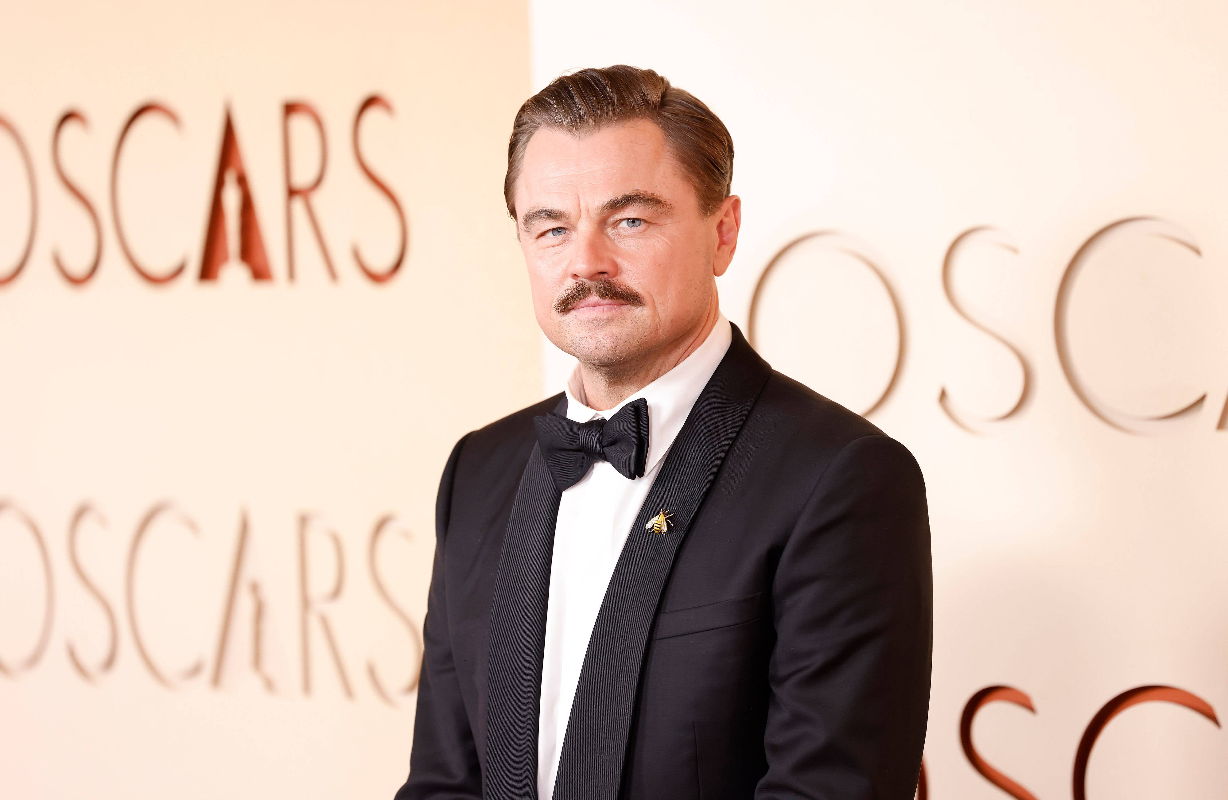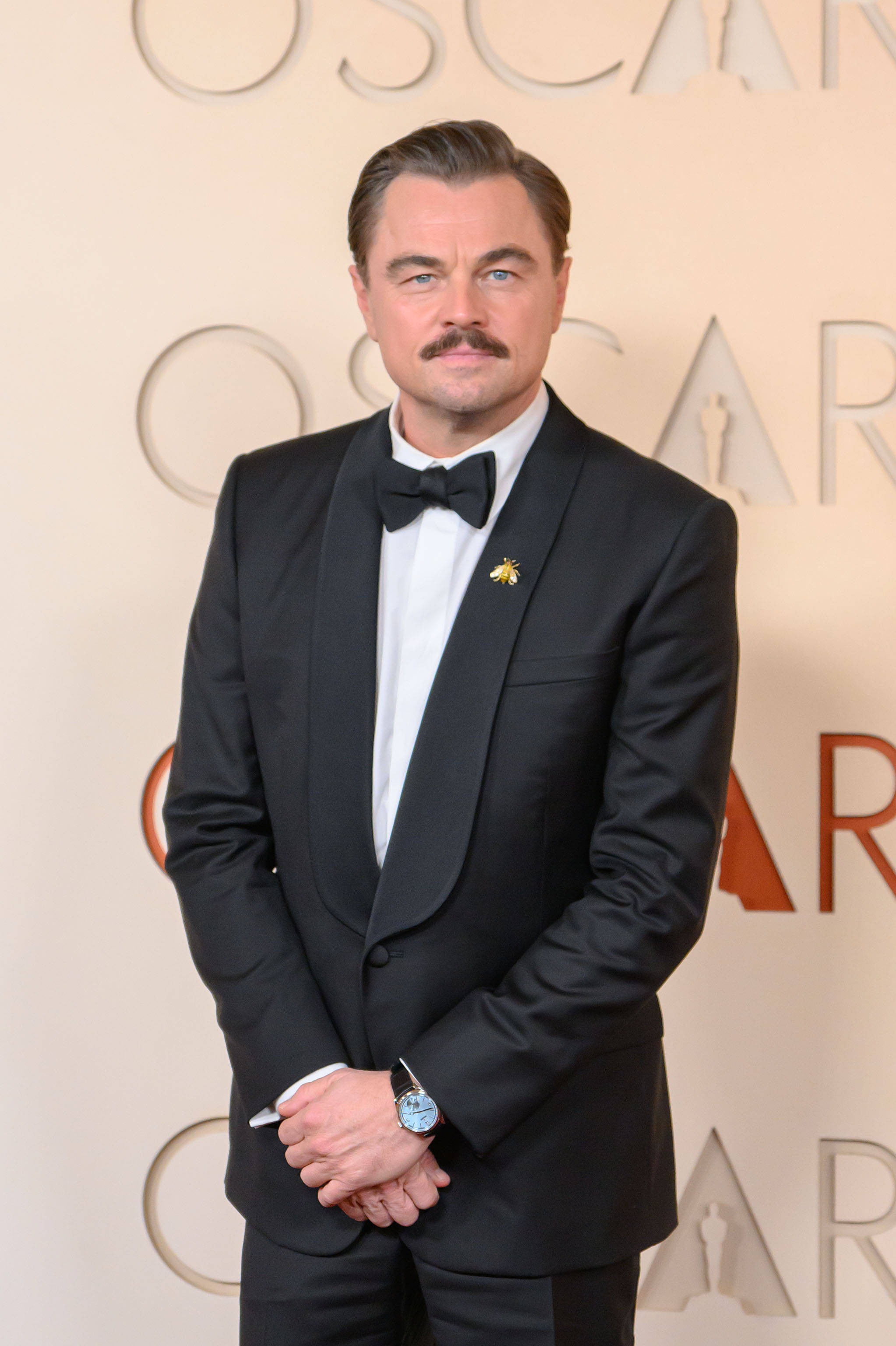 Actorul în vârstă de 51 de ani a păşit pe covorul roşu al premiilor Oscar 2026 într-un smoking negru, completat de o cămaşă albă. DiCaprio şi-a accesorizat ţinuta cu un ceas Rolex şi cu o broşă în formă de albină prinsă pe gulerul sacoului. Elementul care a atras cel mai mult atenţia a fost însă mustaţa.