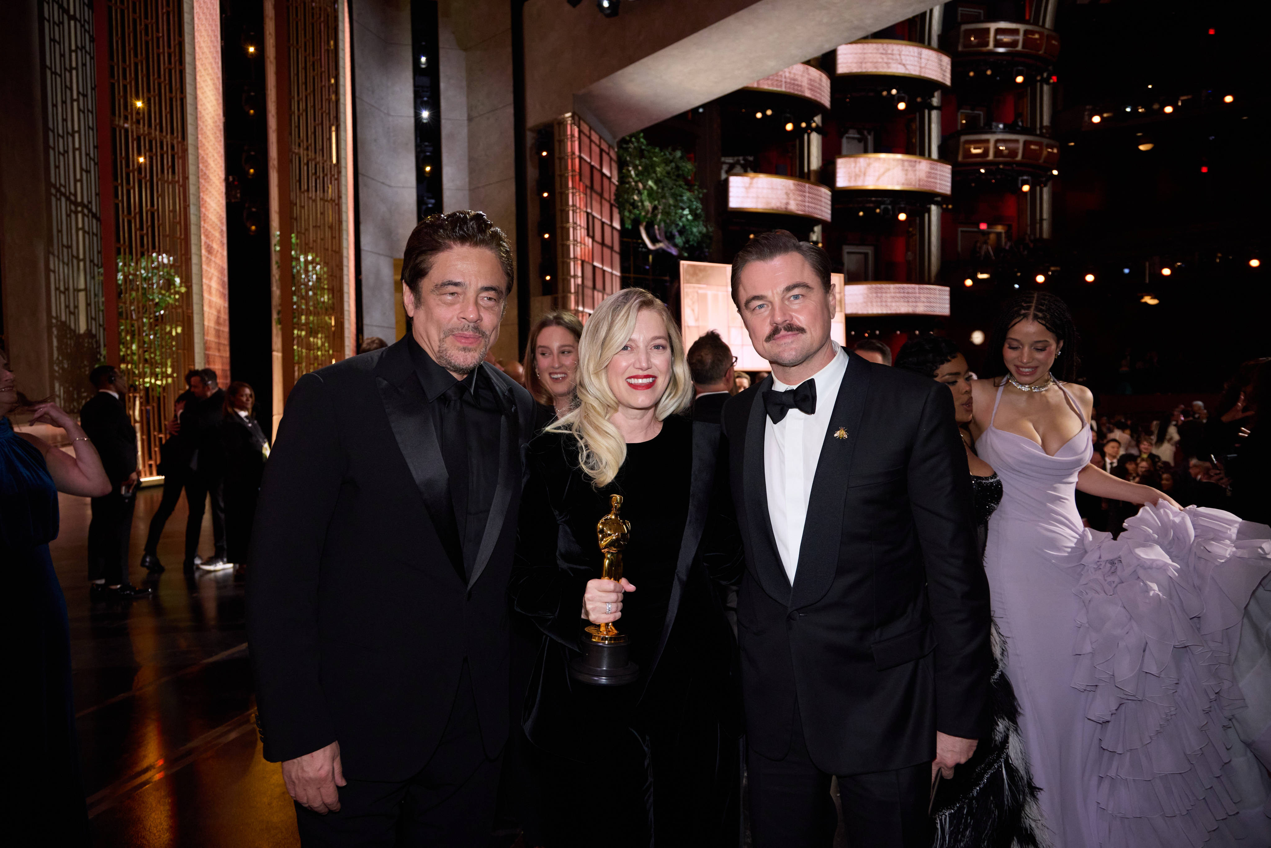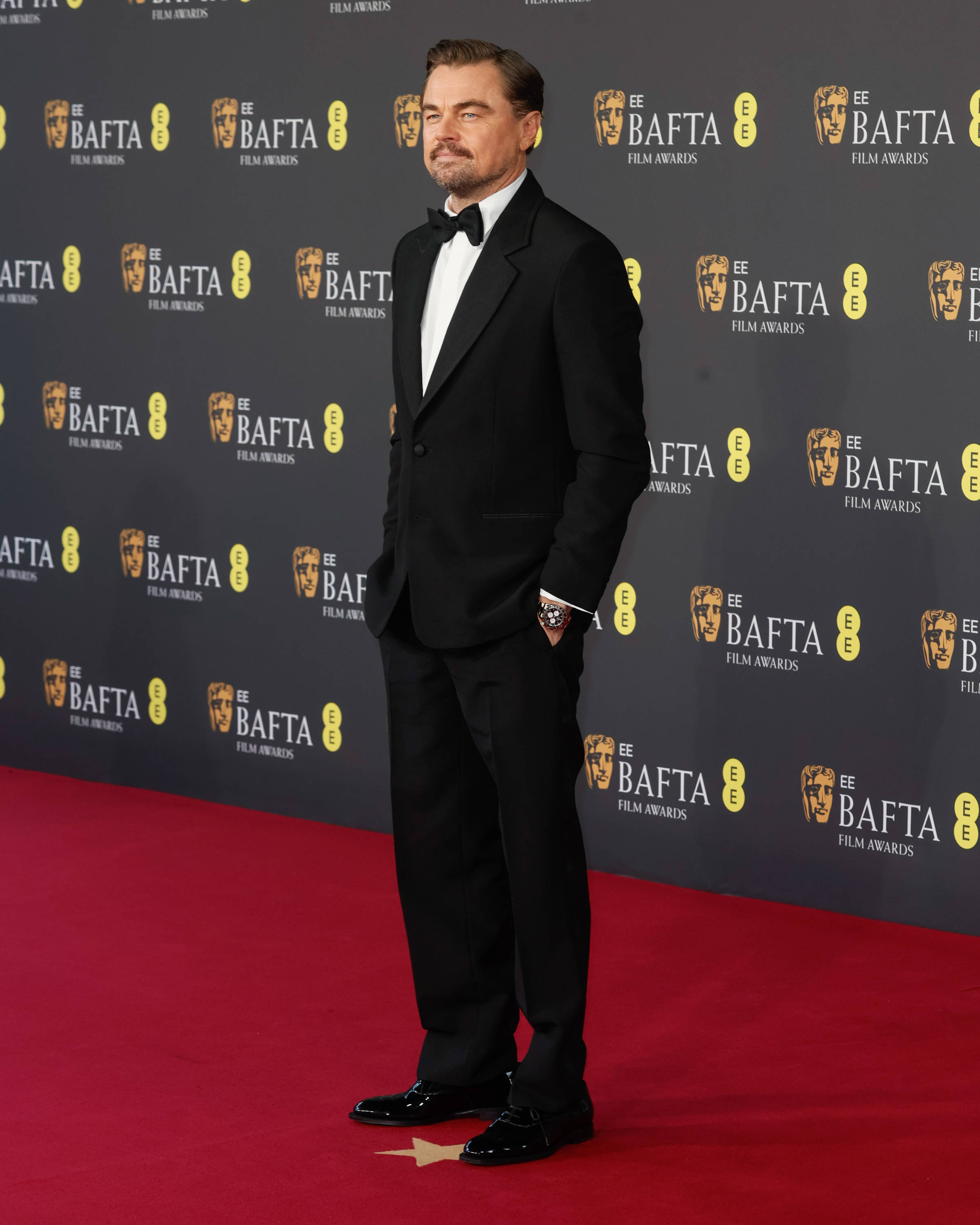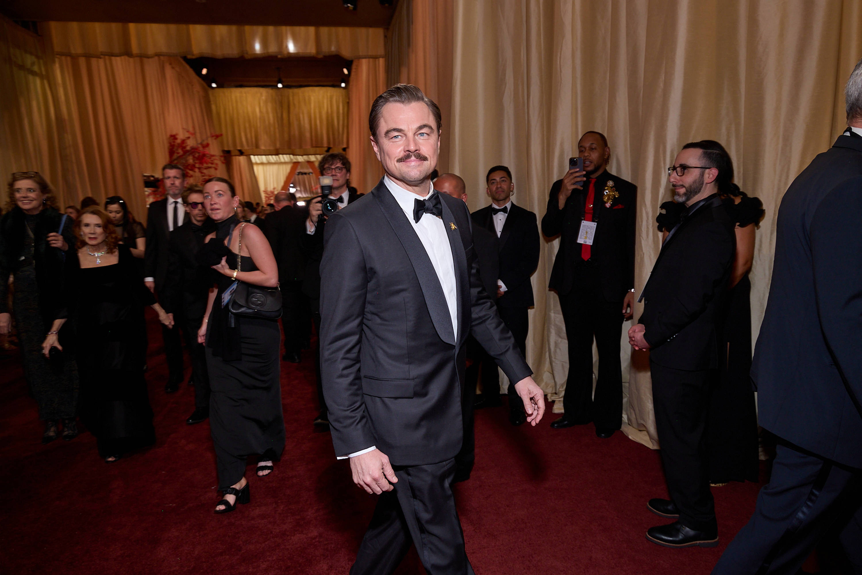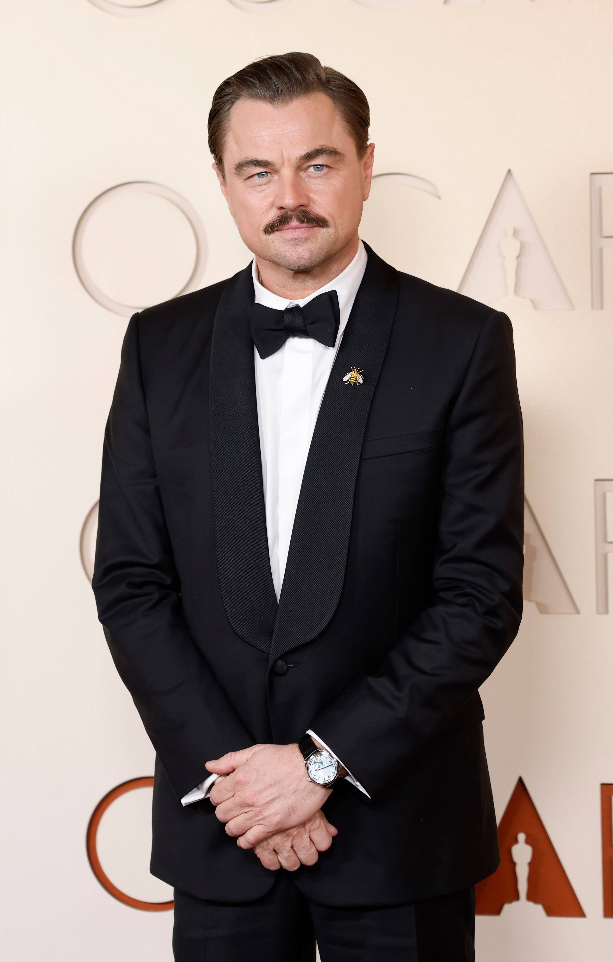 Actorul în vârstă de 51 de ani a păşit pe covorul roşu al premiilor Oscar 2026 într-un smoking negru, completat de o cămaşă albă. DiCaprio şi-a accesorizat ţinuta cu un ceas Rolex şi cu o broşă în formă de albină prinsă pe gulerul sacoului. Elementul care a atras cel mai mult atenţia a fost însă mustaţa.