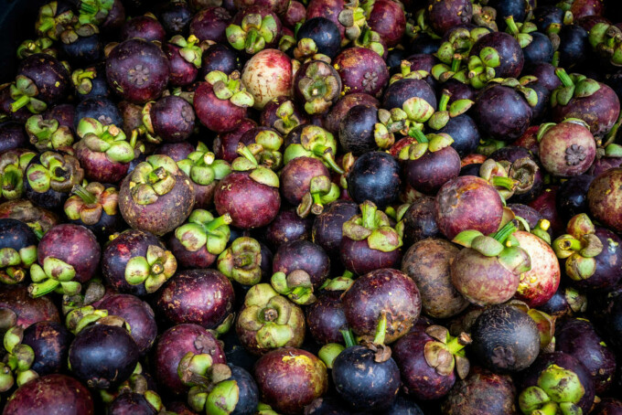 Fructul tropical mangostan este cultivat din abundență în Thailanda. Are dimensiunea unei mingi de tenis, cu o coajă tare, de un violet intens. Acest fruct unic are un gust dulce și o textură foarte fină și este bogat în antioxidanți și micronutrienți. Poate fi găsit în magazinele și piețele cu produse alimentare asiatice.