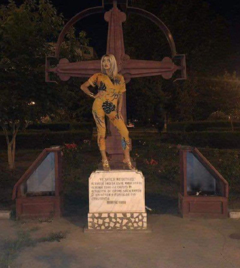 "Scandalos‼️ Revoltător‼️ Strigător la cer‼️ Margherita de la Clejani s-a urcat pe crucea troiței monumentului Eroilor Revoluției, aducând o gravă atingere valorilor noastre crestin-ortodoxe", este un mesaj de pe Facebook.