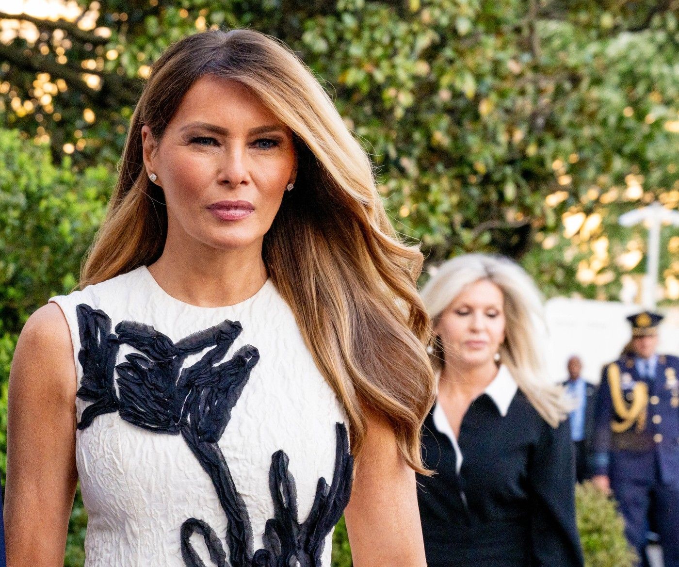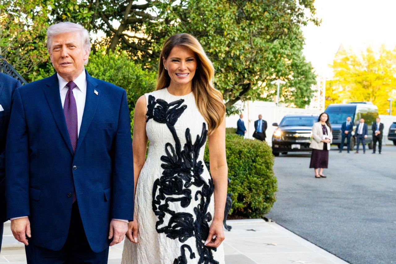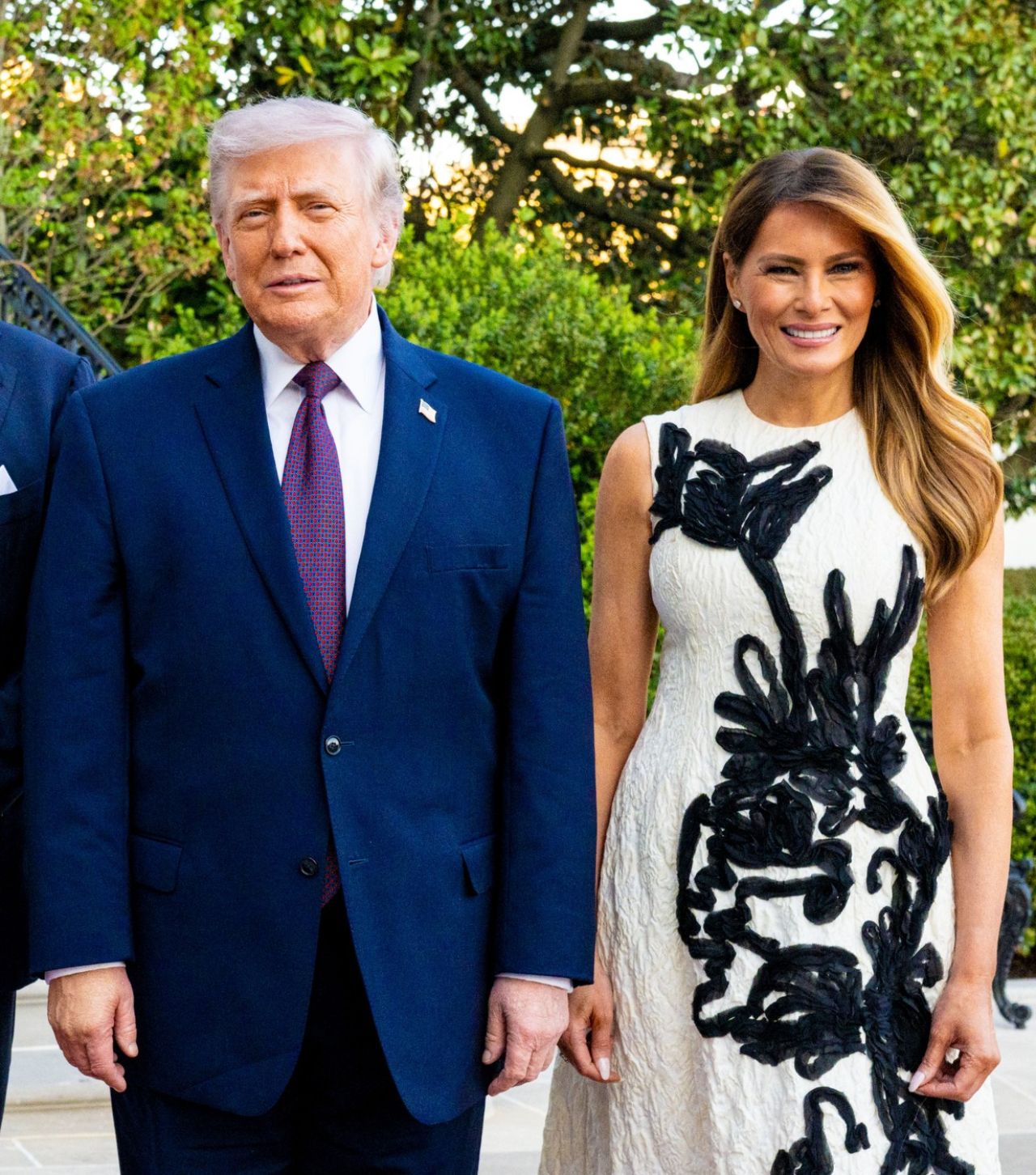 Melania Trump a impresionat printr-o apariție elegantă și rafinată. Prima doamnă a purtat o rochie albă, fără mâneci, cu o croială clasică, pusă în valoare de aplicații florale negre, care au oferit ținutei un contrast sofisticat.