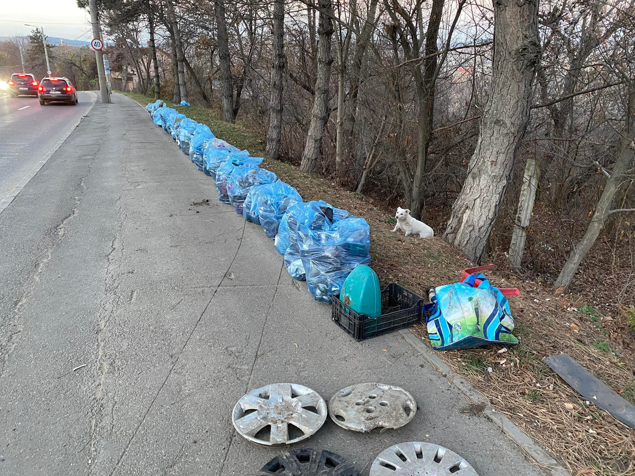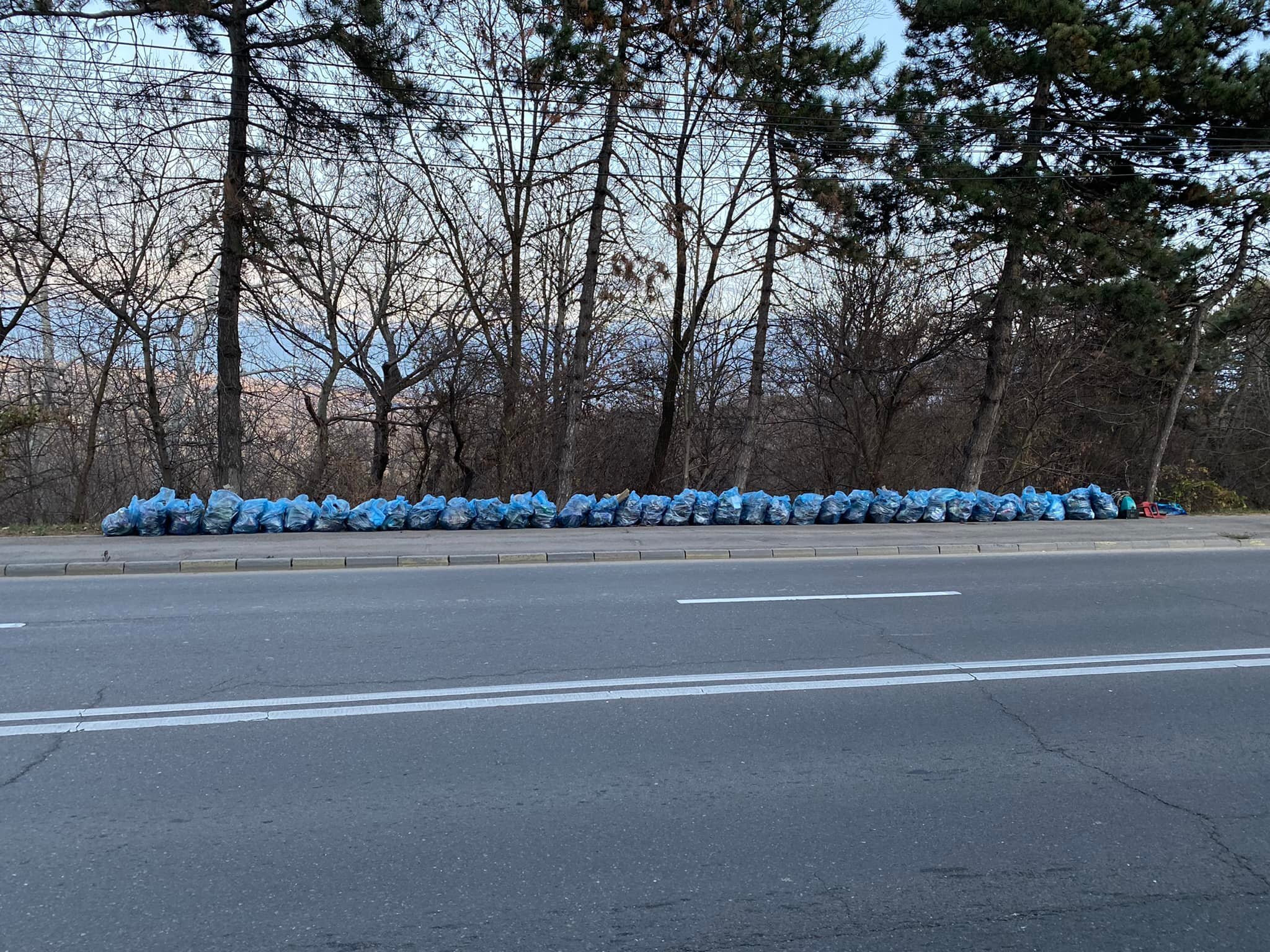Astfel, însoțit de un câțel comunitar, Andrei Bacoș a strâns zeci de saci de gunoaie.