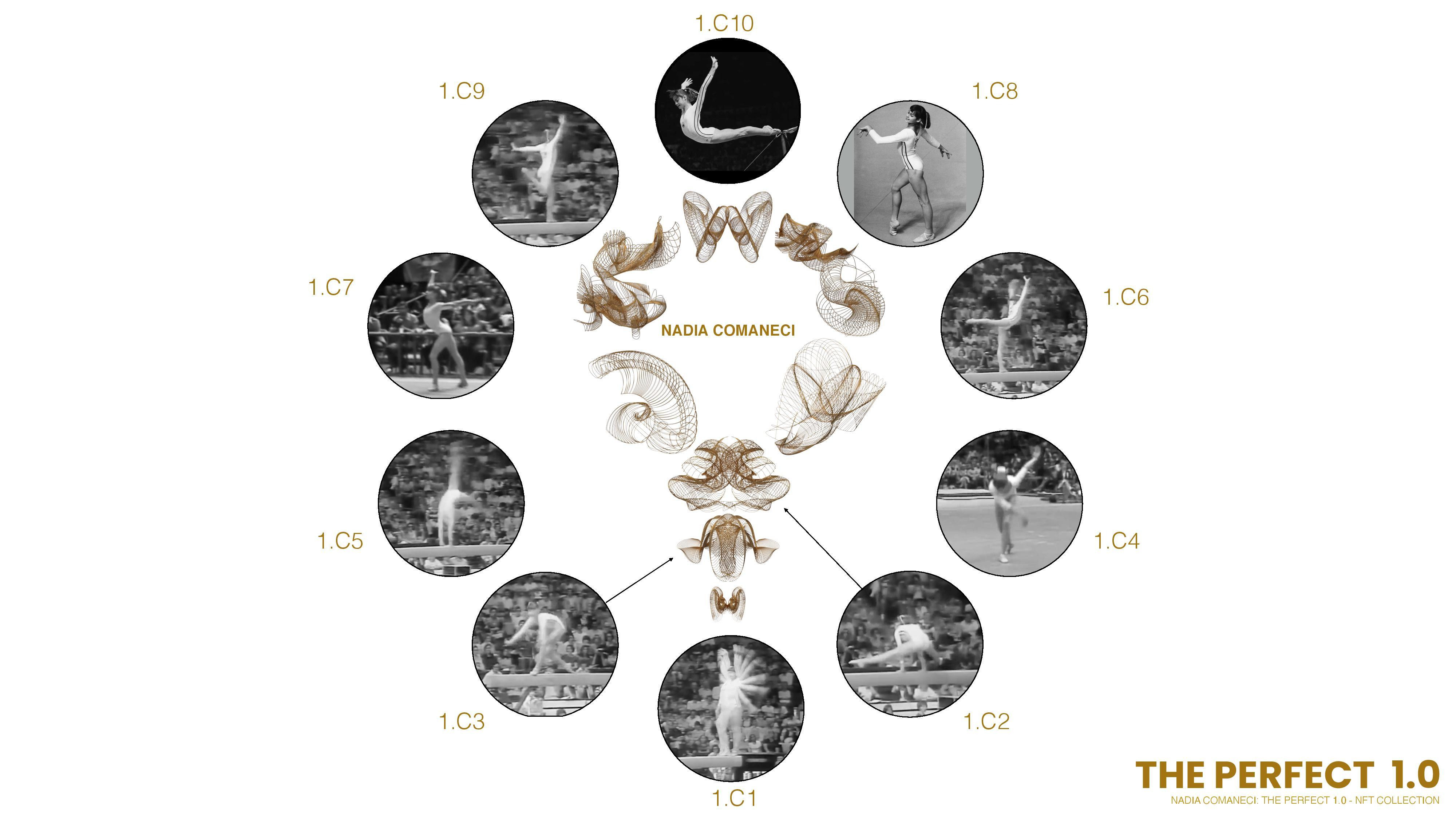Colierul virtual NFT („Non Fungible Token”) surprinde cele 10 mişcări ale ,,Zeiţei de la Montreal", pentru care gimnasta a obţinut un 10 perfect în anul 1976. Creaţia i-a fost dăruită Nadiei într-o gală din cadrul festivalului Romanian Creative Week, ce se desfăşoară la Palatul Culturii din Iaşi. (Vezi galeria foto)