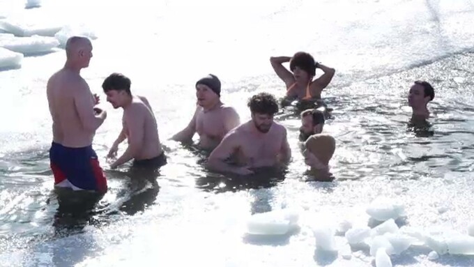 În Timiș, peste 50 de tineri au înfruntat gerul și au făcut baie la copcă. Termometrele au arătat minus șapte grade Celsius, însă această doamnă a reușit să stea 24 de minute între sloiurile de gheață.