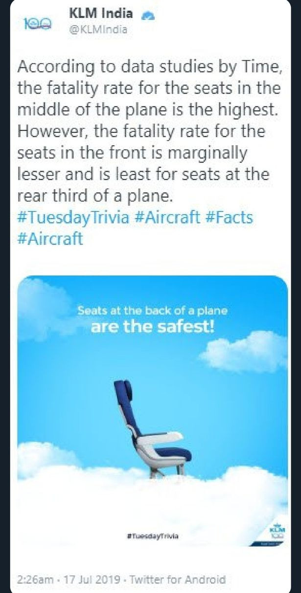 Compania KLM India a postat pe Twitter un mesaj în care arăta unde este cel mai bine să stai în avion pentru a avea cele mai mari șanse de supraviețuire dacă avionul se prăbușește sau are loc o aterizare forțată.