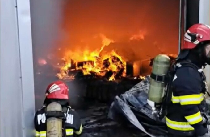 Incendiul s-a extins și la un container modular, unde erau birourile firmei. Pompierii au intervenit cu trei echipaje, dar nu au reușit să salveze mare lucru.