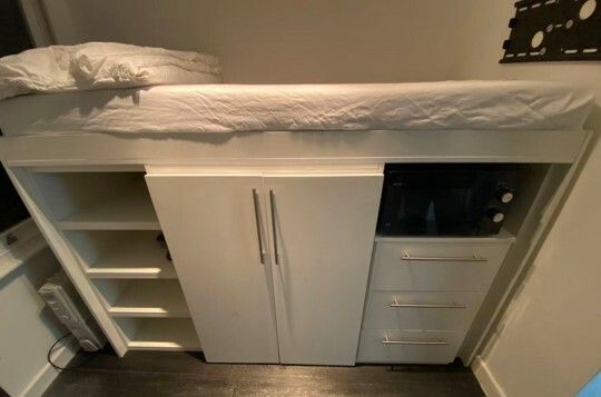 Nu are nici măcar bucătărie, iar cumpărătorul va beneficia de un cuptor cu microunde incorporat în pat, unde se află și un dulap.