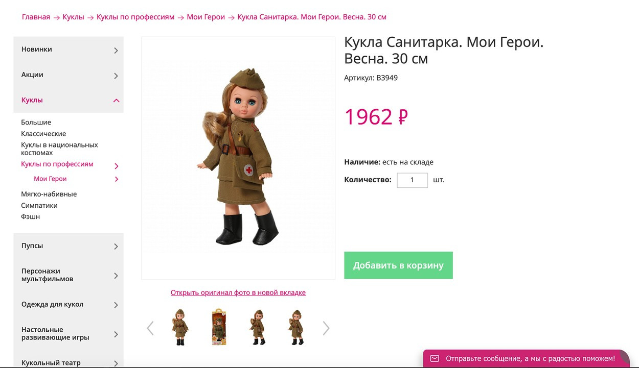 În opinia ei, păpușile reprezintă „propagandă LGBT". Ea promovează în schimb păpușile patriotice rusești Vesna, care sunt în conformitate cu linia ideologică a Kremlinului și sunt îmbrăcate în uniforme de șoferi de tancuri, parașutiști și asistente militare.
